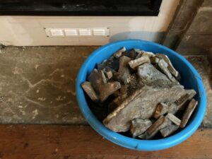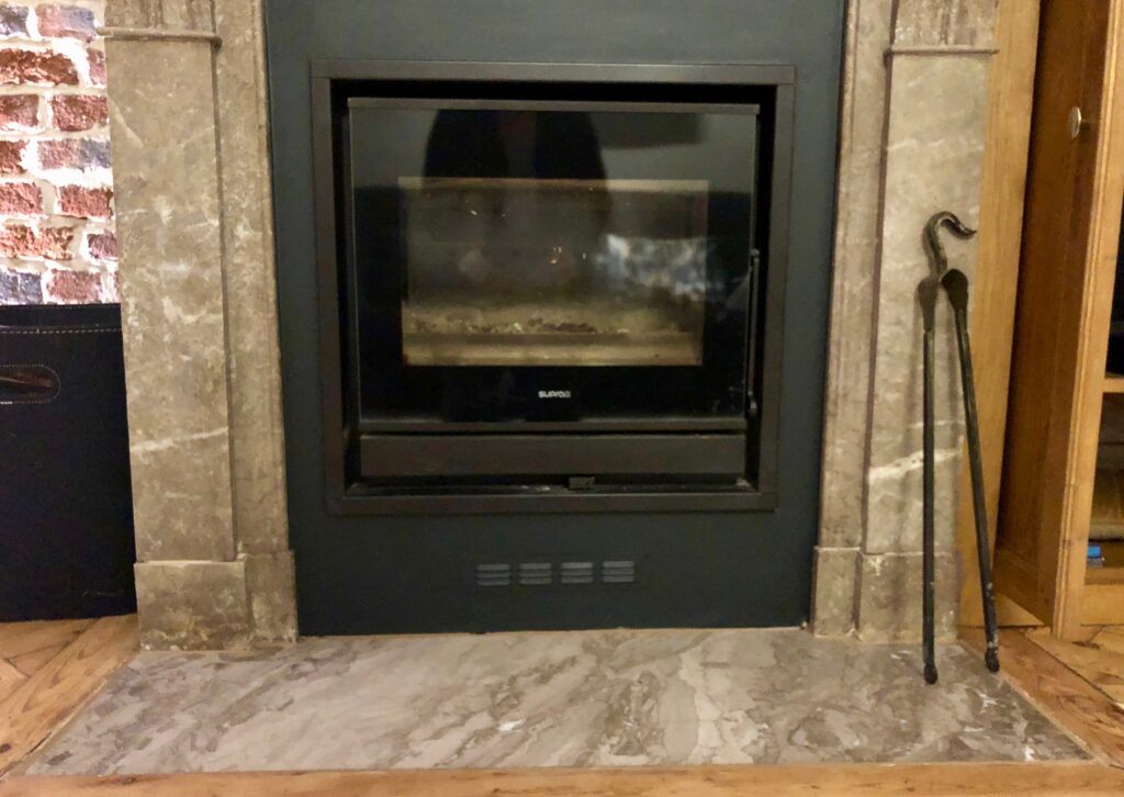 Pendant que cette dalle d’étanchéité séchait (cela a pris des semaines), j’ai commandé une dalle de marbre chez Max Van der Marlière à Comines. J’ai trouvé ses coordonnées sur internet et mon intuition a été la bonne. Dès ma première conversation avec lui, j’ai compris que j’avais à faire à un artisan compétent, attentif et sympa. Je ne me suis pas trompée puisqu’il a livré une belle dalle, dans une teinte très proche, même si pas 100% identique à la cheminée de mon salon. À l’impossible nul n’est tenu…