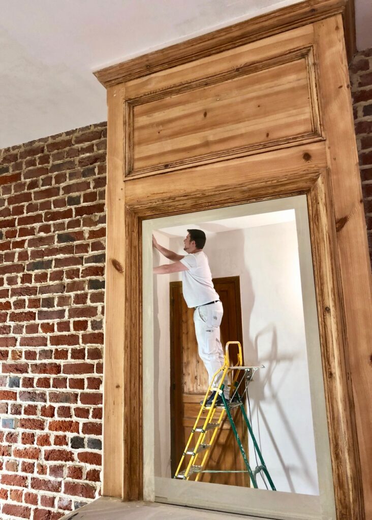 Puisqu’on en est à la cheminée, un mot sur le trumeau. Lassée de sa couleur brun-roux, j’ai décidé de le peindre en noir. Pour cela, mon duo de peintres l’a d’abord décapé avec soin, laissant apparaître un beau pin ancien… que j’ai été tentée de laisser tel quel.