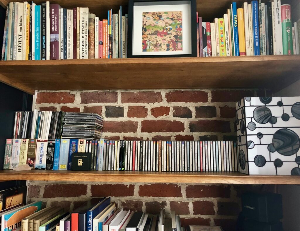 Ce que j’ai conservé aussi, c’est la lampe Tiffany réalisée par mon ancienne collègue et amie Françoise, devenue vitrailliste (lire ici). Dans un premier temps, je l’avais mise dans mon bureau. Mais, après les travaux, je me suis dit qu’elle serait plus à l’honneur dans la bibliothèque du salon.