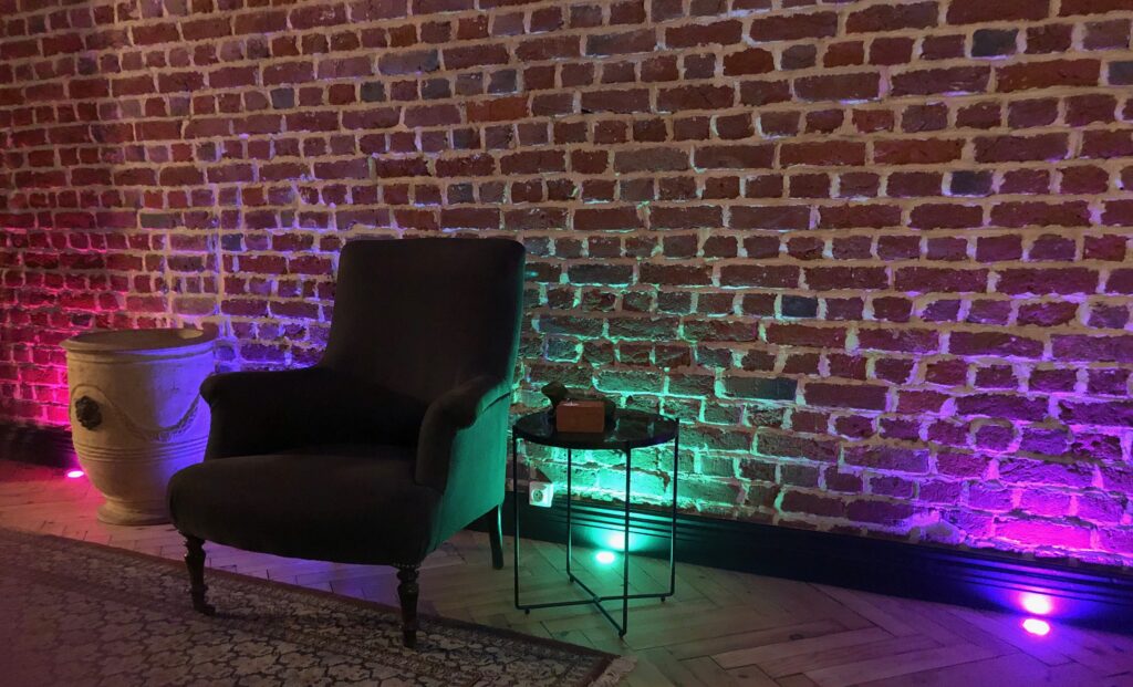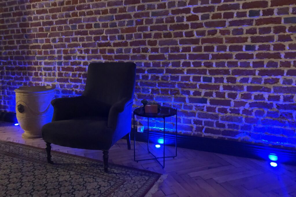 C’est lui aussi qui a réalisé le magnifique éclairage du mur, incrusté dans le sol. J’ai déjà ce type d’éclairage enterré, dans ma cour. C’est un soir d’hiver, en rentrant chez moi et en admirant cette lumière indirecte, que j’ai eu l’idée de faire la même chose dans le salon. Mais en installant cette fois les spots dans le parquet.
