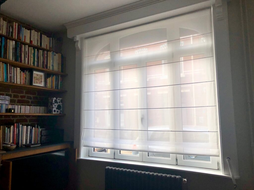 Comme je m’y attendais (il avait déjà réalisé mes anciens rideaux), il a fait un travail nickel, sur mesure et au millimètre. Et a utilisé une petite chaîne métallique pour actionner le store et pas de vulgaires ficelles (qui s’emmêlent toujours, j’ai déjà donné…)