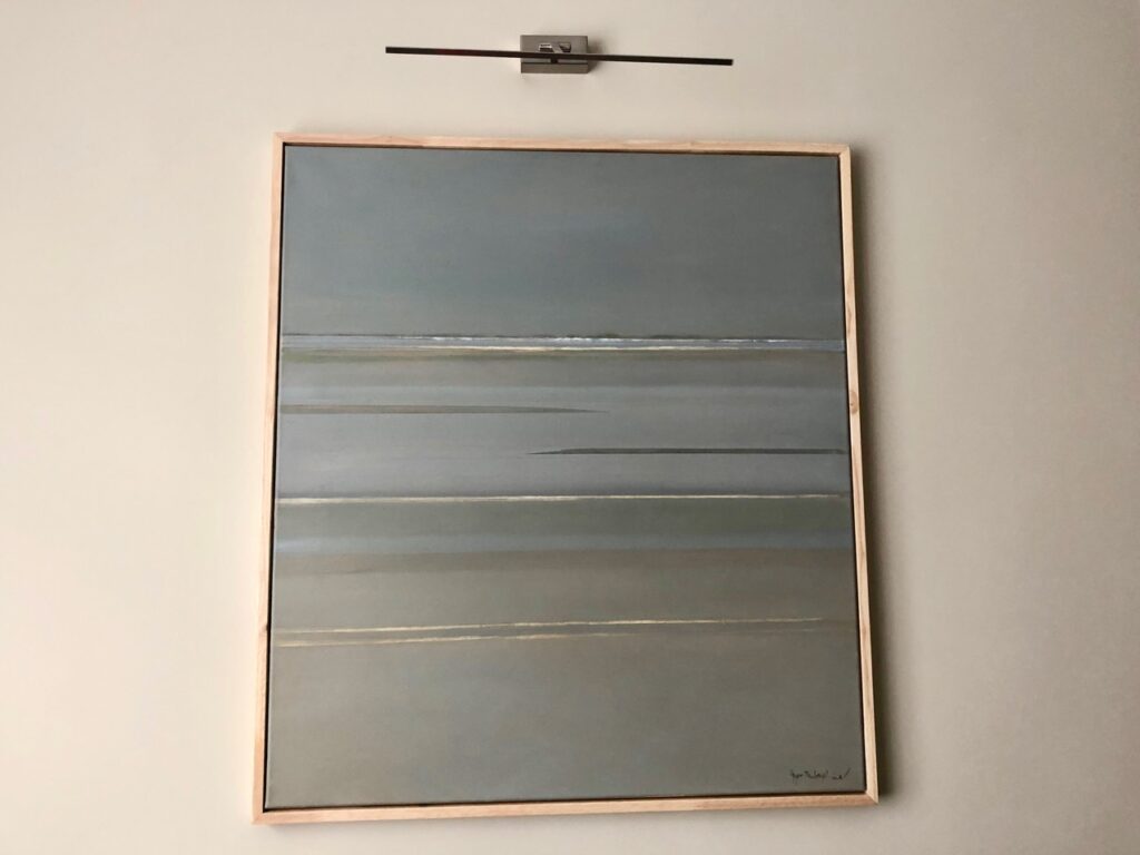 J’ai réfléchi aussi pas mal à la couleur des murs. Au final, je suis partie de cette toile, réalisée pour moi par l’artiste Pippa Darbyshire, pour m’inspirer. J’ai choisi une couleur « craie », à peu près la même que la ou les lignes d’écume du tableau. Vous ne l’avez pas reconnue ? C’est la baie de Somme, stylisée au maximum, comme Pippa aime à la peindre.