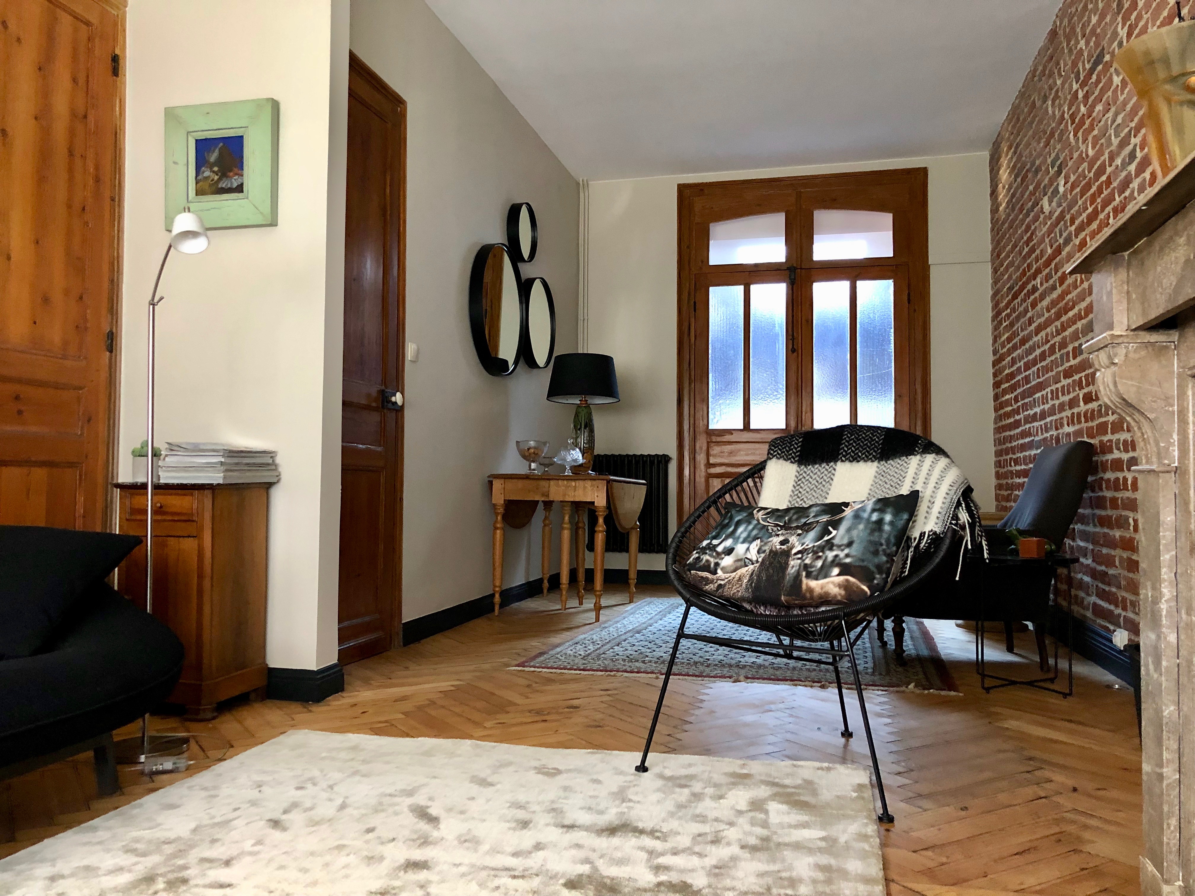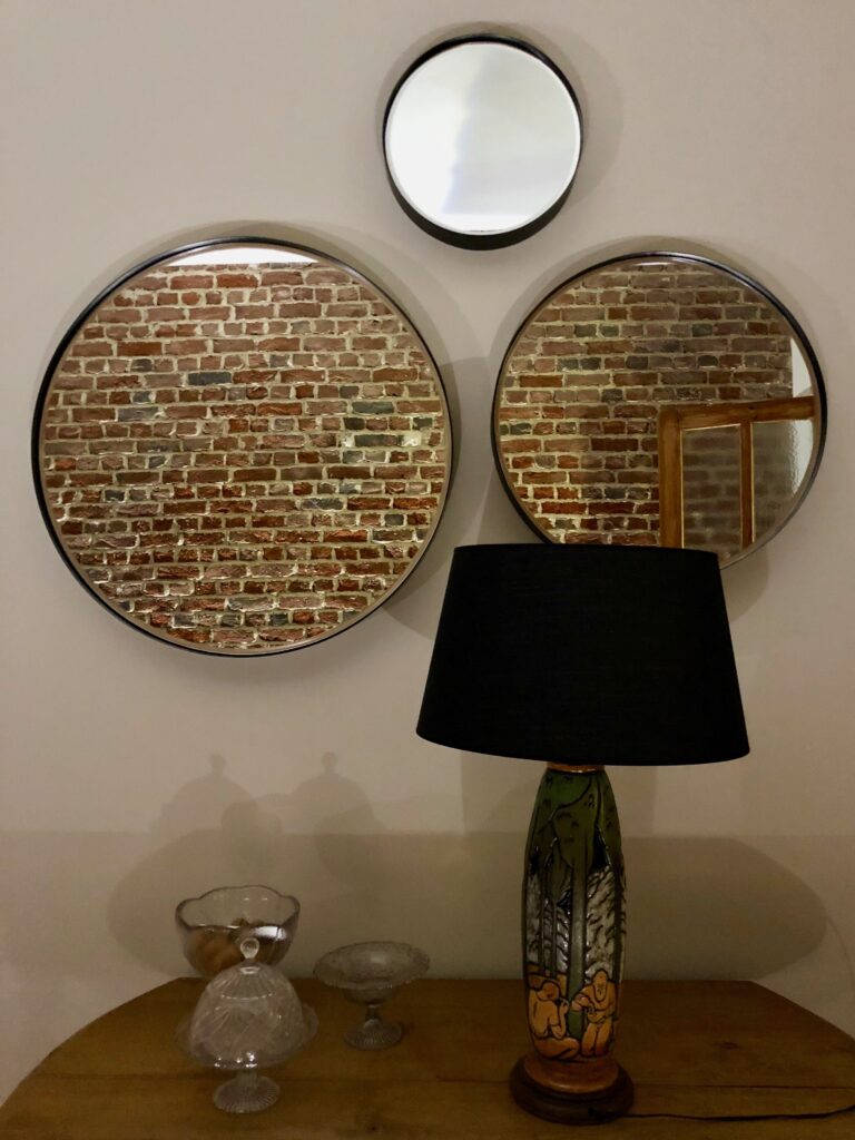 Si j’ai fait le vide, j’ai en revanche acheté cette famille de miroirs ronds cerclés de noir. Ils agrandissent la pièce et renvoient l’image du mur en brique, en face. Je les ai trouvés dans un magasin beau mais pas sympa, que je ne vous conseillerai donc pas. Sur la table, j’ai placé la jolie lampe héritée de mon grand-père strasbourgeois. Toute mon enfance, je l’ai vue sur son bureau. J’ai simplement changé l’abat-jour (43 € chez Alinéa).