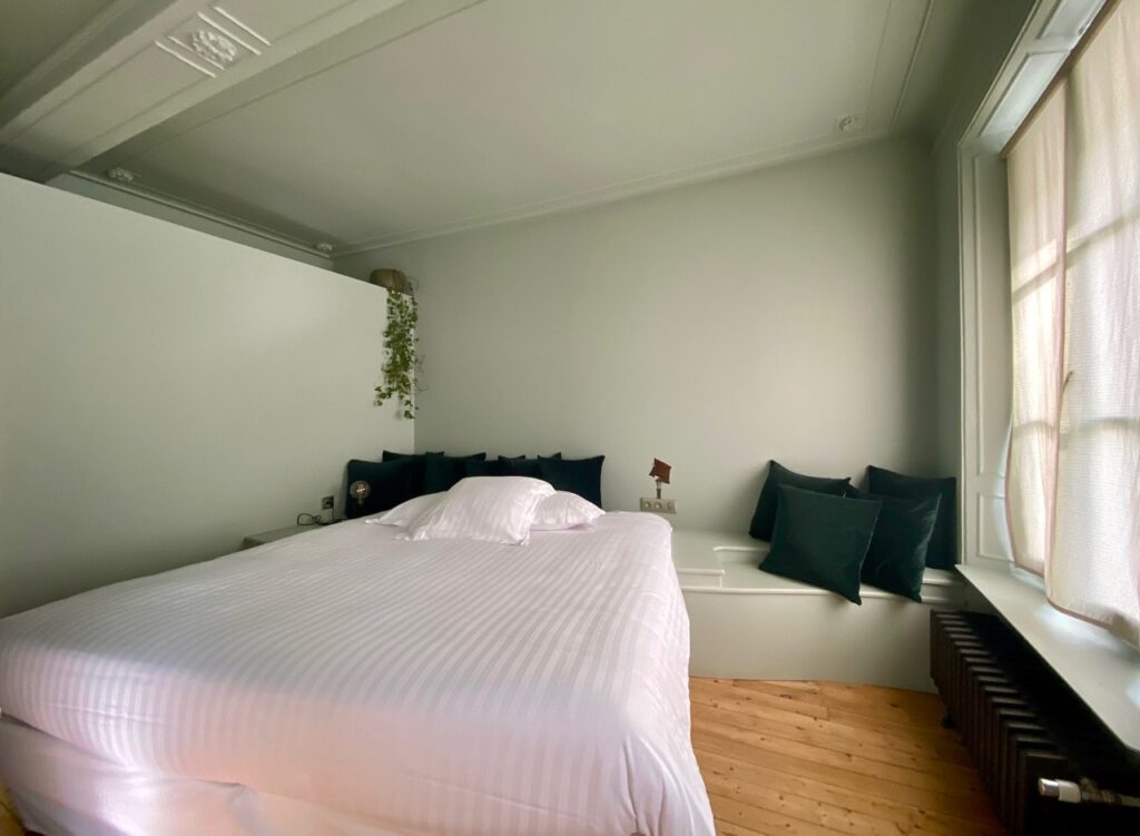 La dernière chambre, la plus spacieuse des quatre, se trouve sous les toits. Avec sa banquette dans l’avant-chambre, elle peut sans problème accueillir trois personnes.