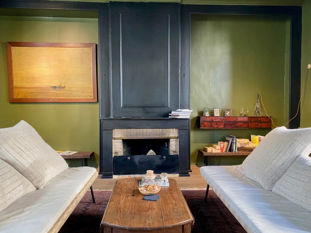 Côté salon, le vert, couleur vedette de la maison, fait son show autour de l’âtre. Sûr qu’il doit faire bon s’y attarder, après une balade ou une bonne table, par une fraîche soirée d’automne.