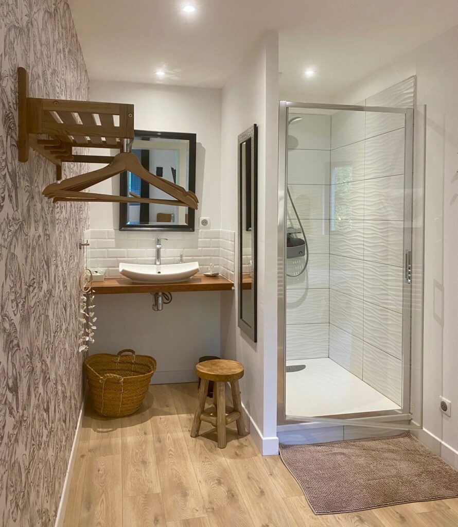 La salle de bain de la chambre Cachette se divise en deux parties, un lavabo dans la chambre et le reste à côté.