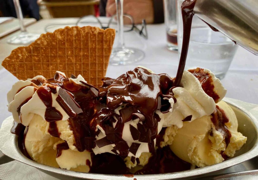 Pour finir ce déjeuner très diététique, j’ai craqué (heureusement mes amis m’ont aidée…) pour une Dame blanche (8,50 €). Je pense que ma photo, avec le (vrai) chocolat qui coule à flot, vaut bien tous les longs discours…