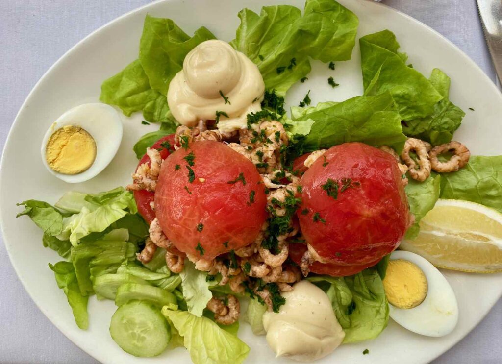 Les garçons, rompus à l’exercice des croquettes, ont préféré un Américain minute/frites (24 €) pour l’un et les traditionnelles « tomates aux crevettes grises zeebrugeoises épluchées à la main/frites » (35 €) pour l’autre.
