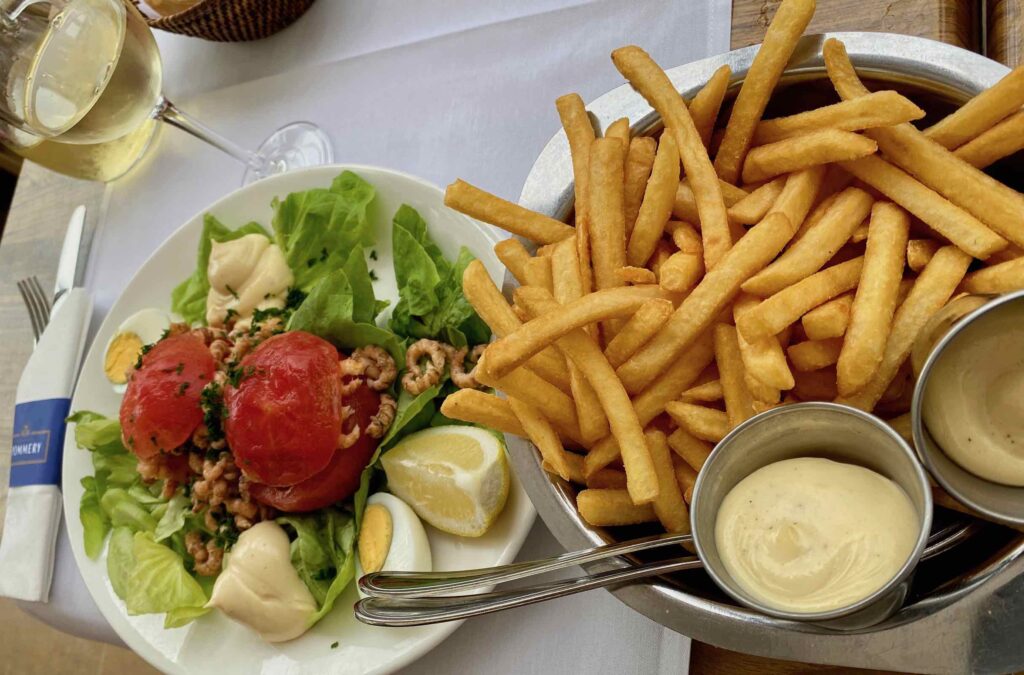 Il faut souligner ce « crevettes grises épluchées à la main », qui signifie que les bestioles ont été décortiquées sur place… et pas au Maroc ou ailleurs comme c’est parfois le cas. Un luxe, au prix de la main d’œuvre locale, qui explique aussi le tarif des plats avec crevettes. Le tout avec des frites juste parfaites et des sauces délicieuses, faites maison. On a beau dire mais une mayo maison, c’est déjà le début du bonheur !