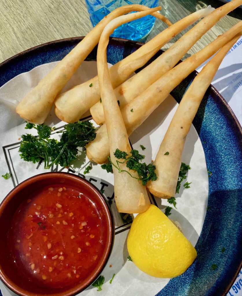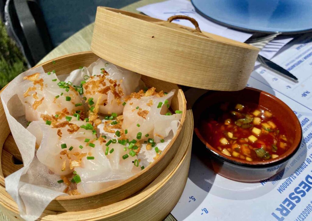 Quelques mois plus tard donc, j’ai opté pour le petit panier rempli de Dim Sum de crevettes, avec une sauce aigre-douce (15 €). Avant de succomber aux crevettes (encore !) déguisées (ici on les appelle Torpedo, prix 14,90 €), autre manière de déguster ces petits crustacés, rois de la côte.