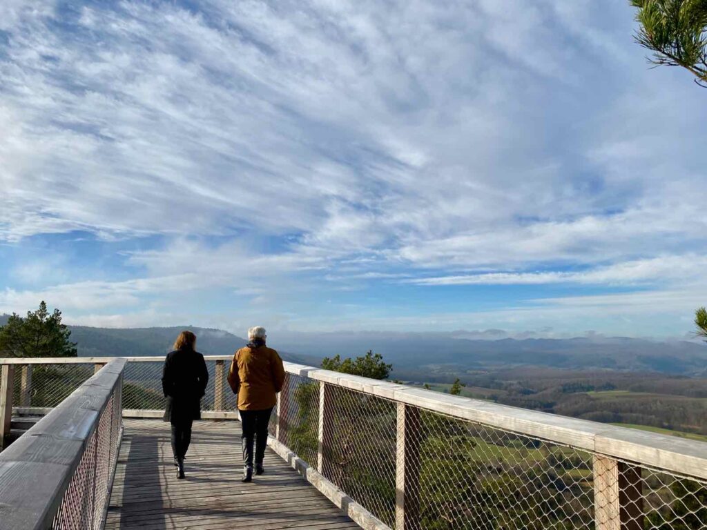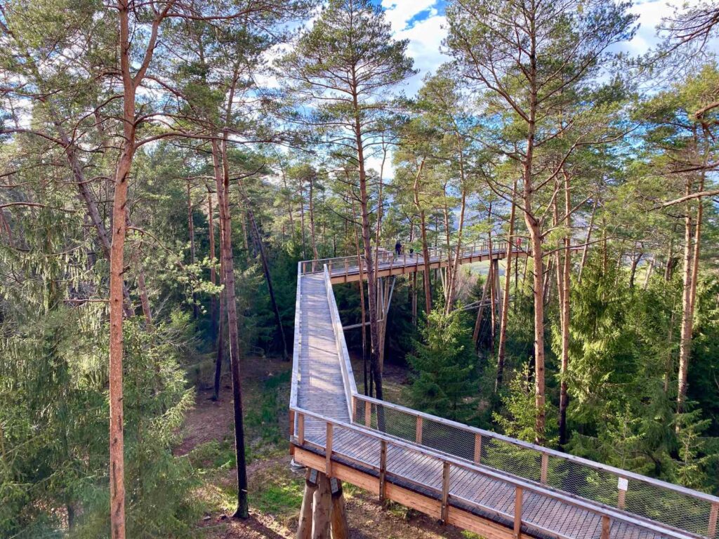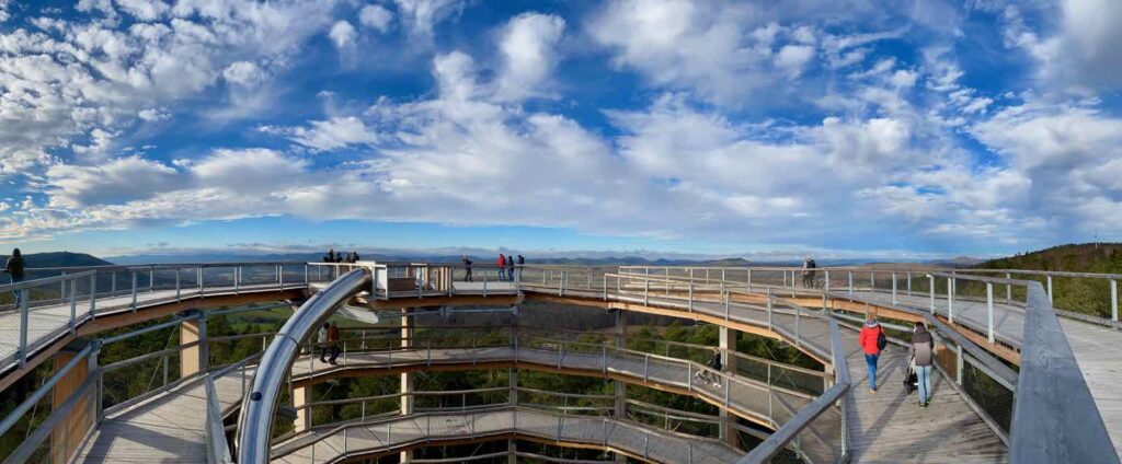 Une fois passée la billetterie, le Chemin des Cimes déroule son parcours de planches sur 1050 mètres de long, offrant des panoramas assez exceptionnels. On avance sur un sentier de bois bien sécurisé, offrant une vue parfaitement dégagée. Ou on chemine au milieu des épicéas, des pins et des hêtres, jusqu’à 23 mètres de haut.