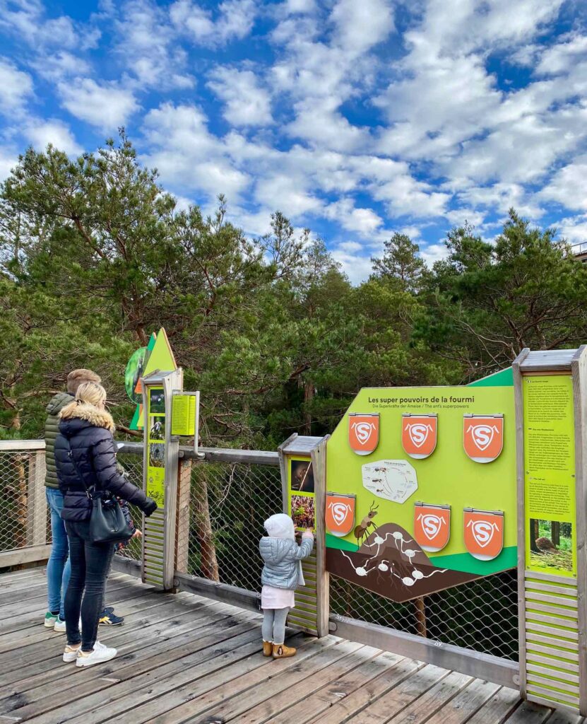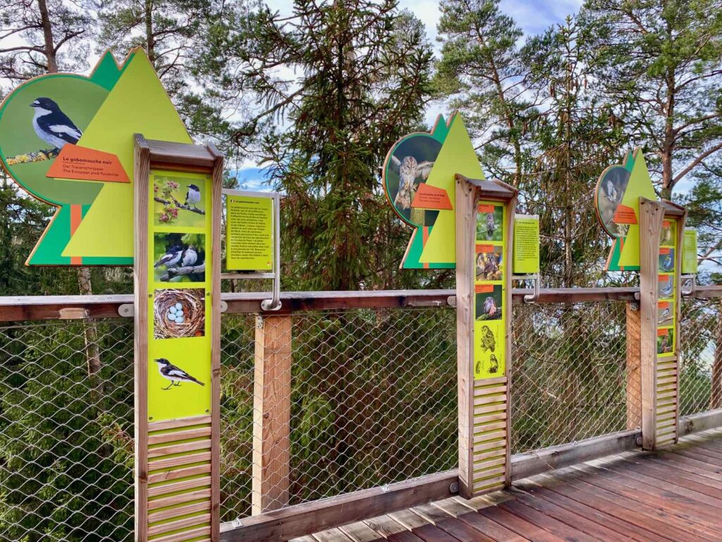 Au fil du Chemin des Cimes, on découvre des panneaux d’information sur la faune et la flore locales, mais aussi des « stations d’apprentissage », qui permettent aux enfants de s’instruire tout en s’amusant.