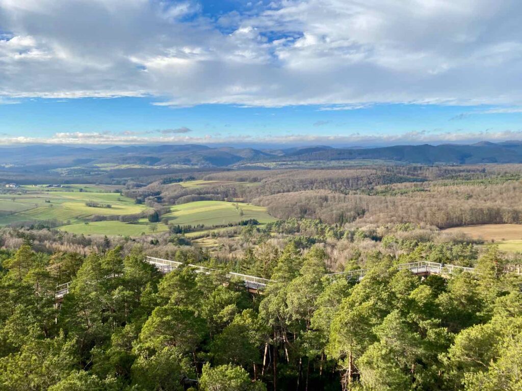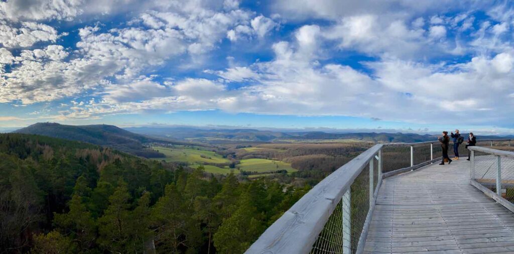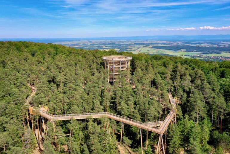 Mais le Graal reste l’ascension de la tour panoramique, une sorte de gros escargot en bois, qui tourne, qui tourne jusqu’au sommet, à 29 mètres de haut. De là, la vue est encore plus unique, entre plaine du Rhin, Forêt-Noire et Vosges du Nord. Comme un balcon sur l’immensité…