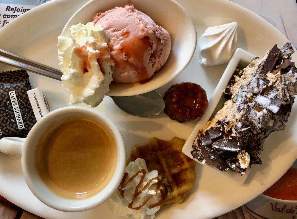 Et en dessert, nous avons pris des cafés gourmands, comprenant une glace à la fraise (du coin), une mini gaufre, un morceau de merveilleux et un cannelé, un peu perdu parmi ces desserts du Nord…