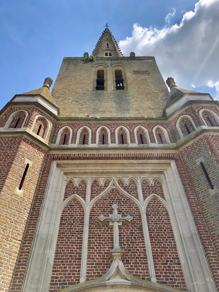 On prend le petit chemin qui part derrière l’office de tourisme et le moulin et nous voici à l’église. C’est une hallekerke ou église-halle, entourée du cimetière et de la traditionnelle haie d’aubépine. J’ai trouvé à l’ensemble beaucoup de charme…