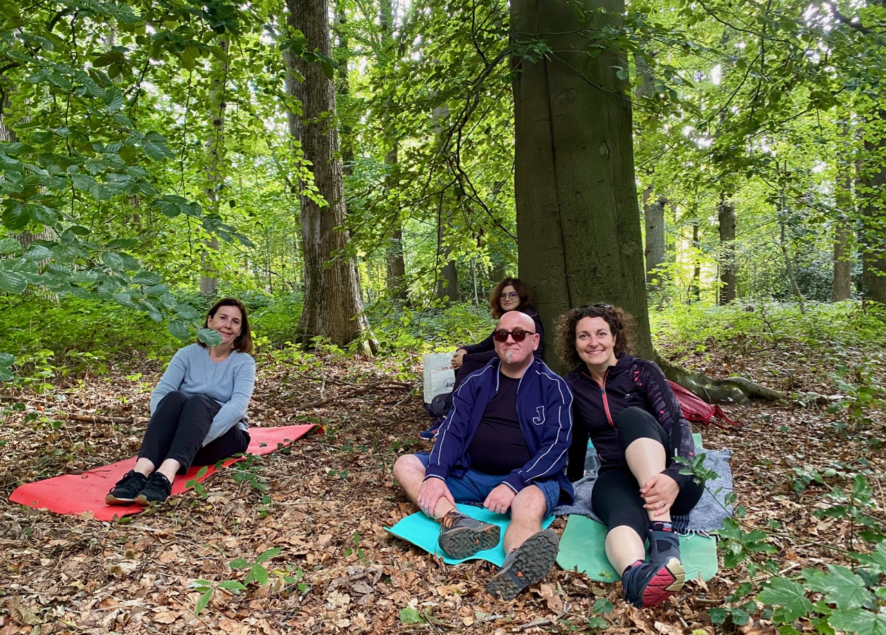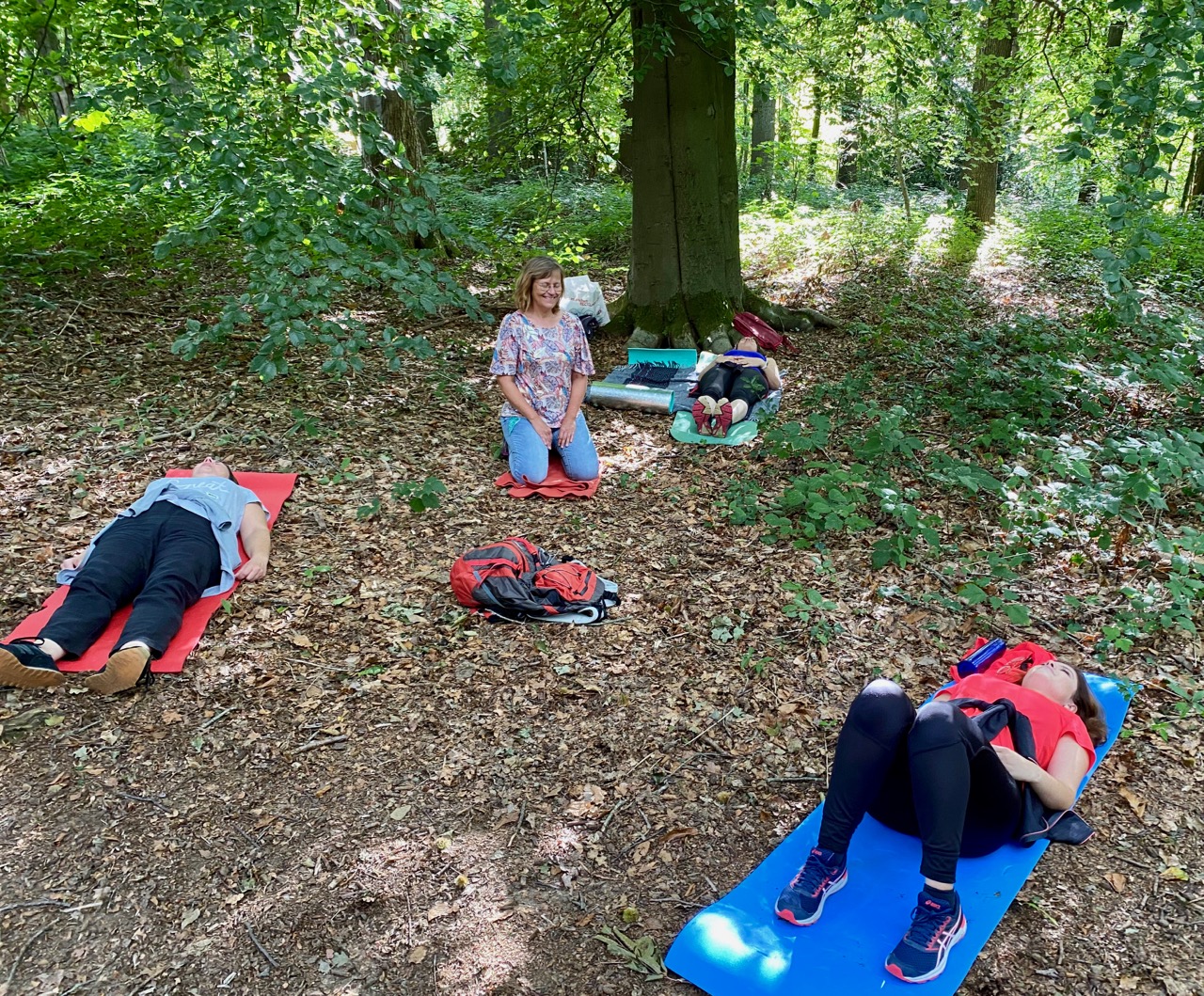 Dernière pause dans un sous-bois et cette fois on déroule les tapis de sol. On s’allonge tranquillement sur le dos et c’est parti pour une séance de sophronisation ou scan corporel.