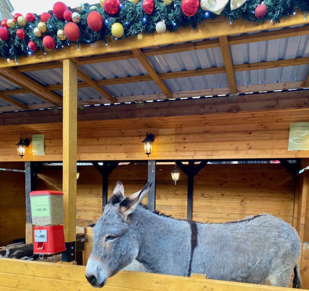 Un petit âne gris, accompagné de moutons, accueille les visiteurs à l’entrée du marché de Noël de Pilsen. Les enfants adorent le nourrir et, vu le nombre de poignées de granulés qu’il ingurgite, il doit finir sa journée bien ballonné…