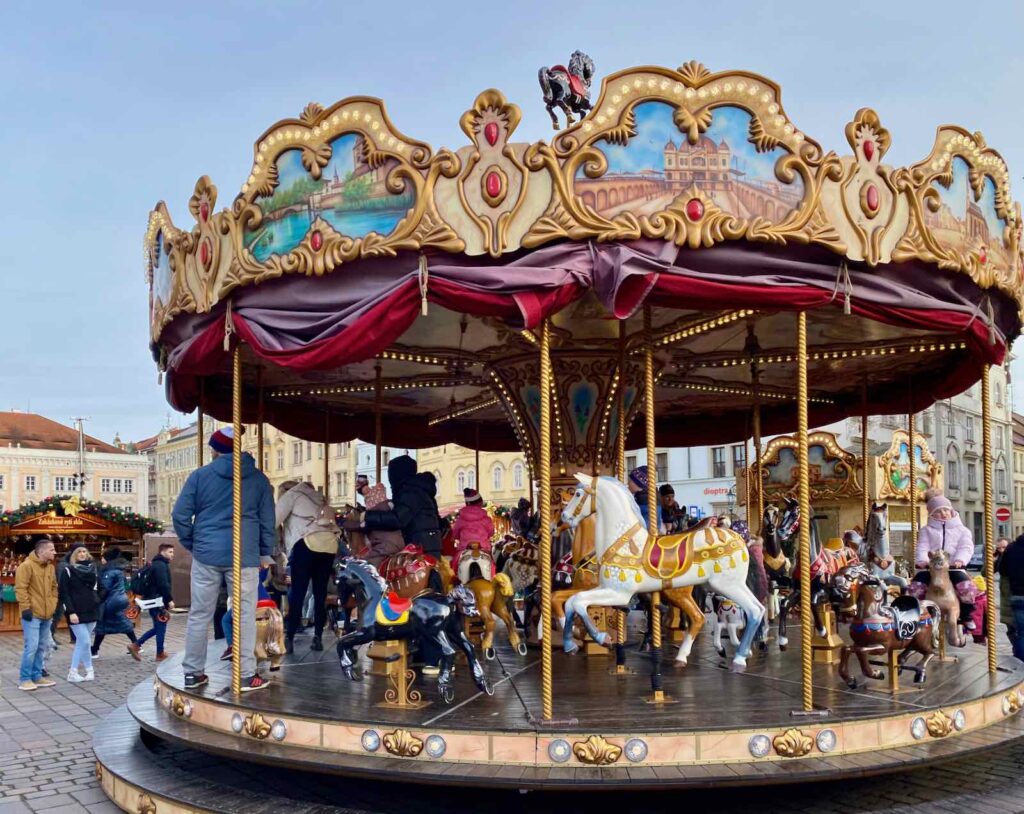 Elle est un peu la star du marché de Noël de Pilsen, éclairant à elle seule le ciel, à la nuit tombée. Le prix d’un tour ? 100 couronnes tchèques, soit environ 4 €. À comparer au prix d’un tour à Lille (7 €) ou à Bruxelles (10 €) !