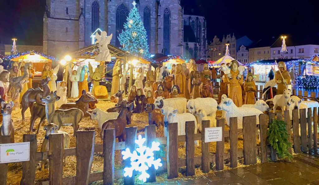 Dans certaines villes, on a tendance à l’oublier. Mais Noël est avant tout la fête de la Nativité, célébrée par les Chrétiens. Merci donc à Pilsen de respecter la tradition et d’installer une immense crèche en bois, presque grandeur nature, avec sa sainte famille, ses anges, ses rois mages, ses bergers et tous ses animaux.