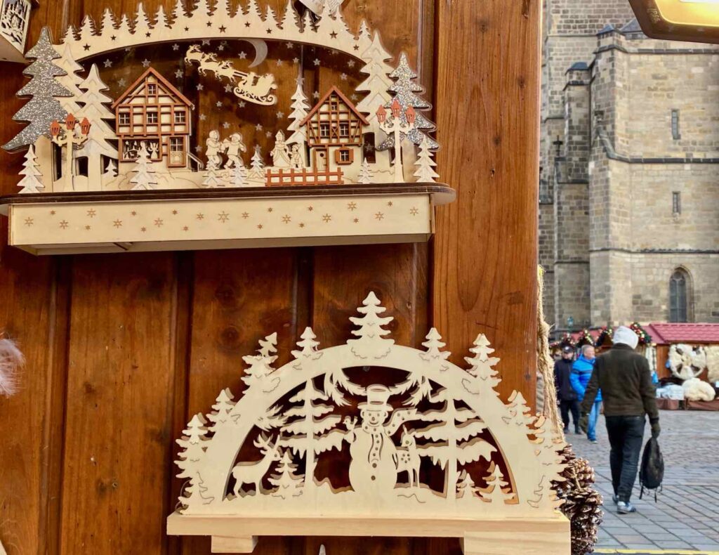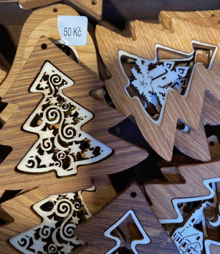 Je m’en doutais un peu. La plupart des jolies choses en vente au marché de Noël de Pilsen sont en bois. Des étoiles, des cloches ou des sapins à accrocher à l’arbre de Noël.