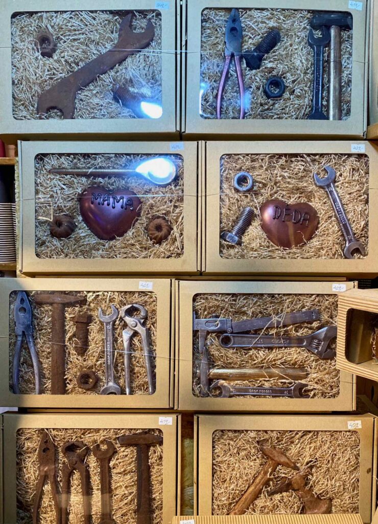 J’ai déjà vu les mêmes chez nous. Des marteaux, clés à mollette, pinces, écrous et tenailles tout en chocolat. La différence, c’est qu’au marché de Noël de Pilsen, Déda (papa) a droit à son coffret d’outils, tandis que Mama aura des ustensiles de cuisine. Oulala ! Faudrait pas que nos féministes voient cela…