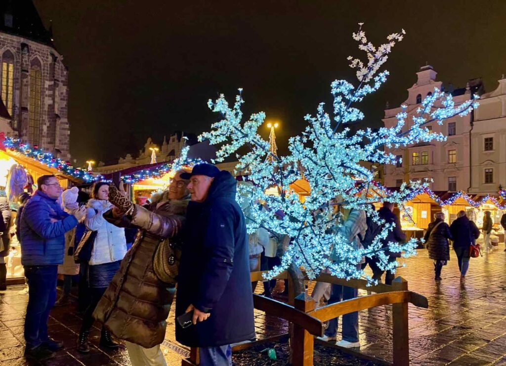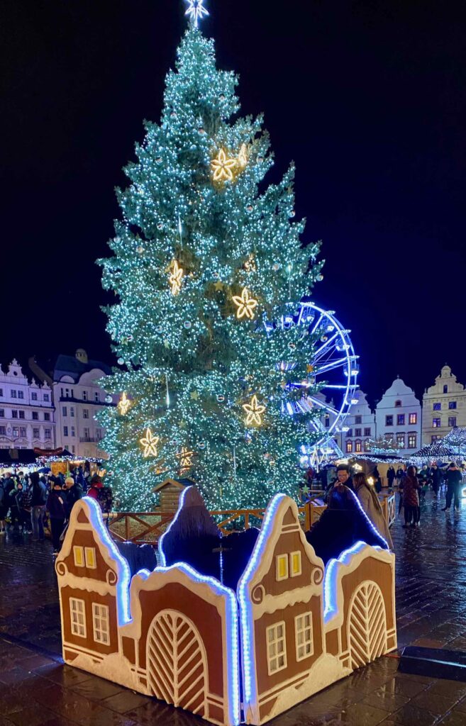 Le marché de Noël de Pilsen a bien sûr le sien, qui trône en bonne place, au milieu des chalets. J’aime beaucoup sa sobriété, juste habillé d’étoiles et de guirlandes lumineuses.