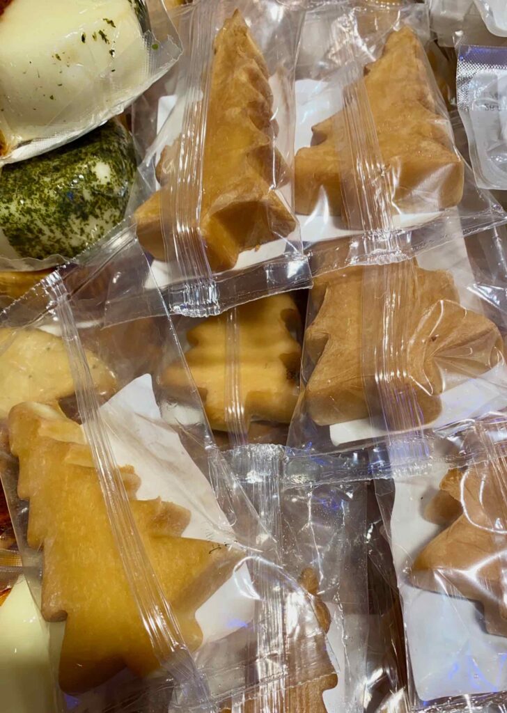 Au rayon nourriture, c’est le fromage qui remporte la palme d’or du marché. Des fromages venus de Hollande, des fromages locaux inconnus chez nous et même des fromages en forme de sapins de Noël !