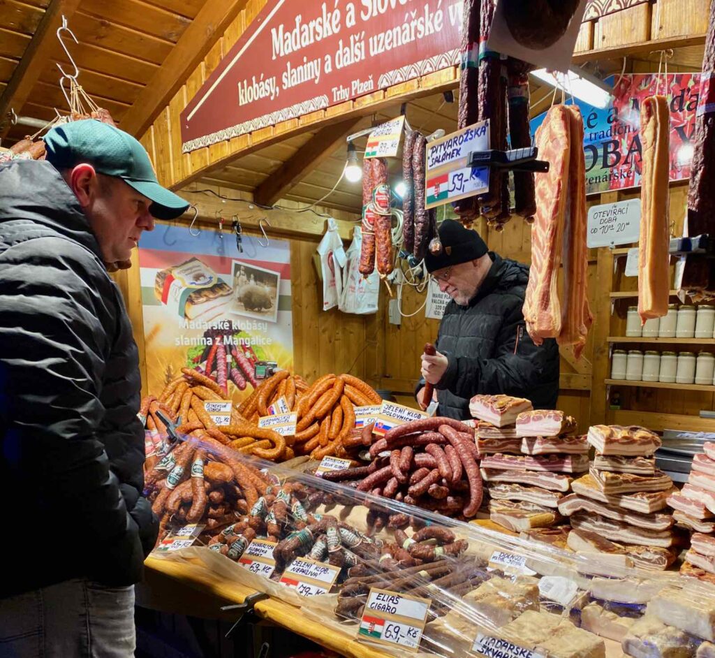 Cela vous viendrait-il à l’esprit, à vous, de visiter un marché de Noël pour en rapporter du lard ? À Pilsen, c’est monnaie courante. À moins de préférer les saucisses ou saucissons.