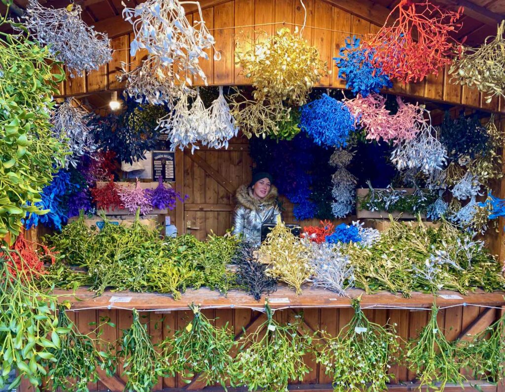 Les bouquets de houx et de gui, accrochés aux portes ou dans les maisons pour porter bonheur à l’occasion de l’année nouvelle, on connaît tous. Mais aviez-vous déjà vu des bouquets de houx et de gui multicolores ? Moi pas ! Et j’ai beaucoup aimé ce tableau coloré, rehaussé du joli sourire d’une madone.