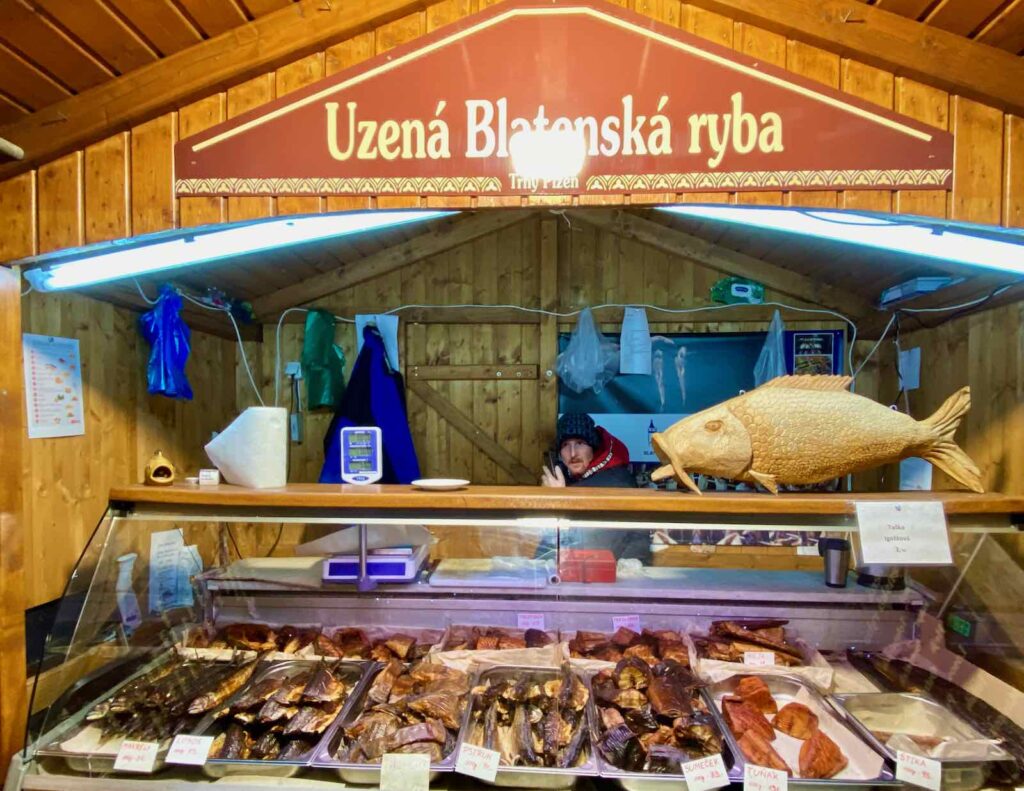 Vous en aviez déjà vu des marchands de poisson sur un marché de Noël ? Moi jamais ! Ici, on aime le poisson fumé ou séché, qui a droit à son chalet.