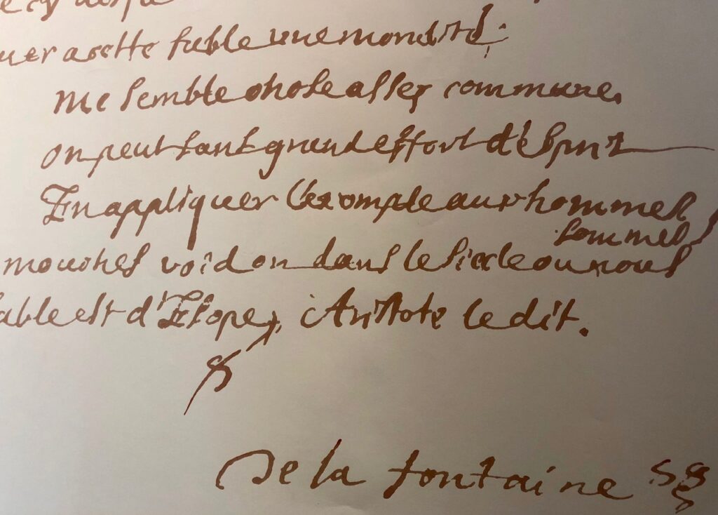 Ah non, il y a peut-être plus touchant encore, c’est cette lettre manuscrite signée de la main de La Fontaine. C’est donc ainsi qu’il écrivait ! Avec un D qui ressemble à un petit pont…