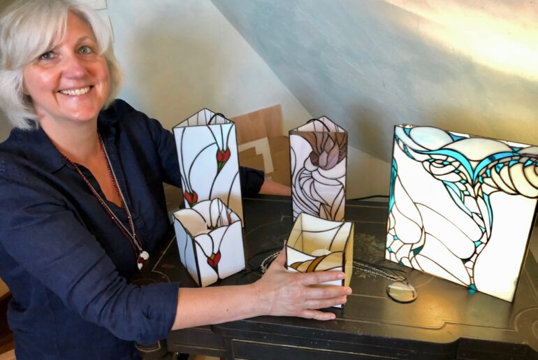 La vie est décidément très facétieuse ! Qui aurait pensé qu’elle serait l’un des premiers artisans d’art dont je parlerais dans la rubrique « Déco » de ce blog ? Une passionnée qui crée des vitraux Tiffany et divers objets pour la maison. Il y a à peine plus de six mois, Françoise Tourbe était journaliste à « La Voix ». Comme moi. Des années à cheminer ensemble, notamment dans l’Aisne d’où elle est originaire. Et nous revoilà installées autour d’un café. Elle, entrain de parler de Verronimo, son atelier d’art. Moi, entrain de l’écouter, pour vous raconter tout cela sur ce blog. La vie est décidément pleine de facéties !