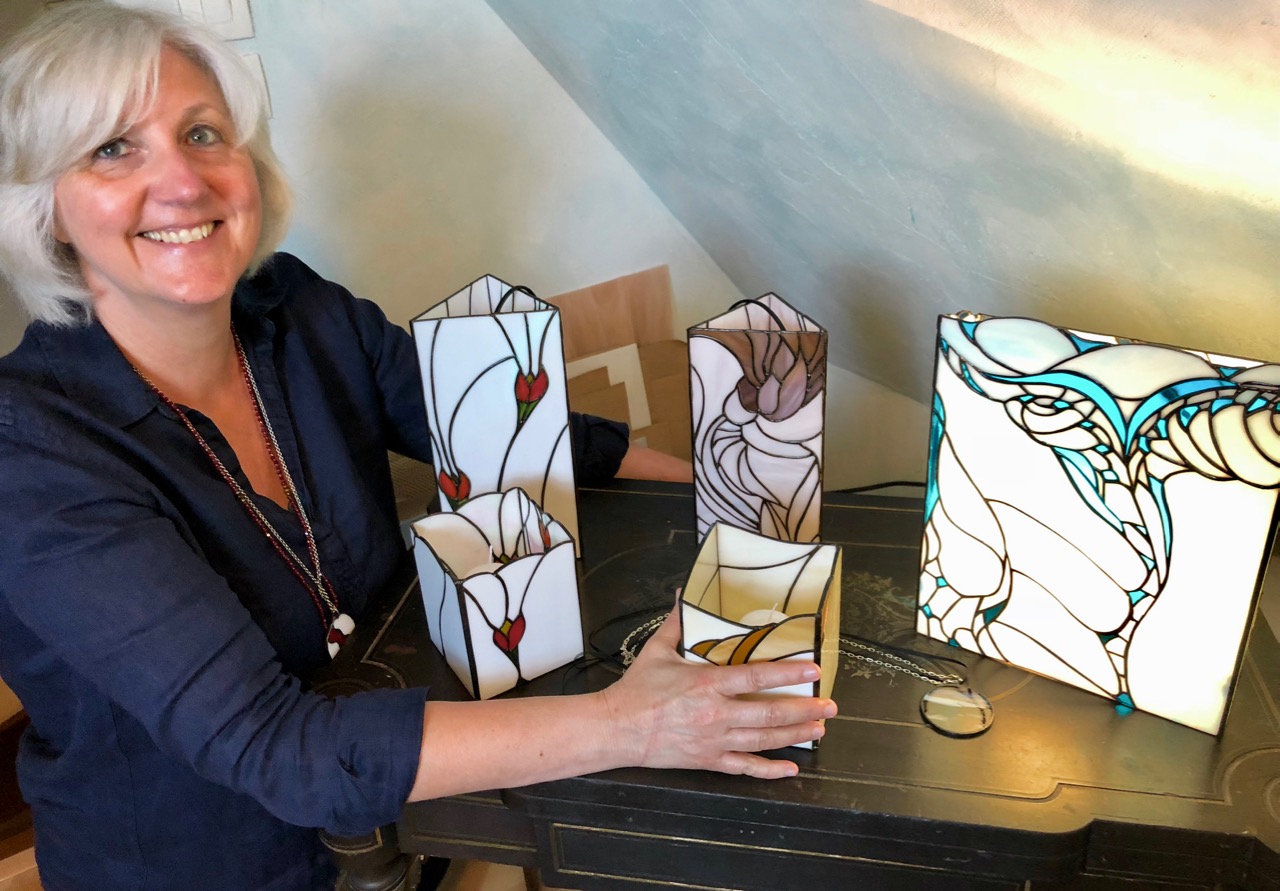 Un an plus tard, elle fait un autre stage, cette fois dans le Sud, et découvre la technique du vitrail Tiffany. Plus fine, plus souple, plus précise que celle du vitrail traditionnel.
