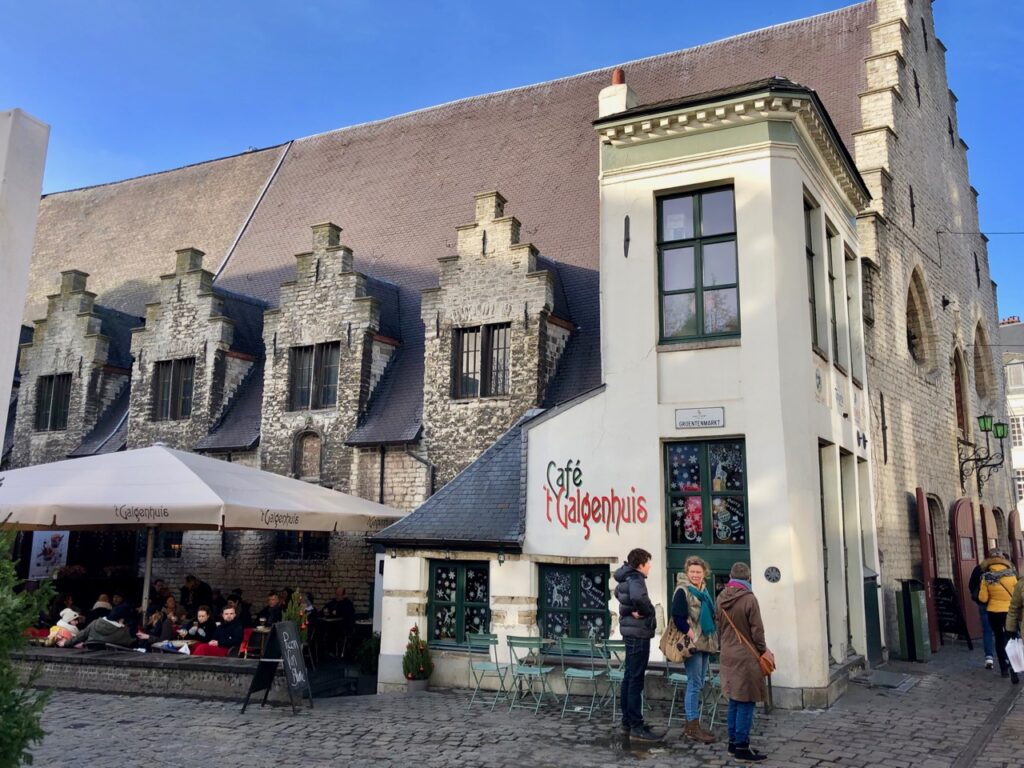 On dit que c’est le plus petit café de Gand, avec une terrasse plus grande que sa salle. On dit aussi que c’est là que les condamnés prenaient leur dernier verre ou leur dernier repas, Galgenhuis signifiant « maison à la potence ». Mais mon guide m’a affirmé que c’était une légende… Le genre qui plaît aux touristes…