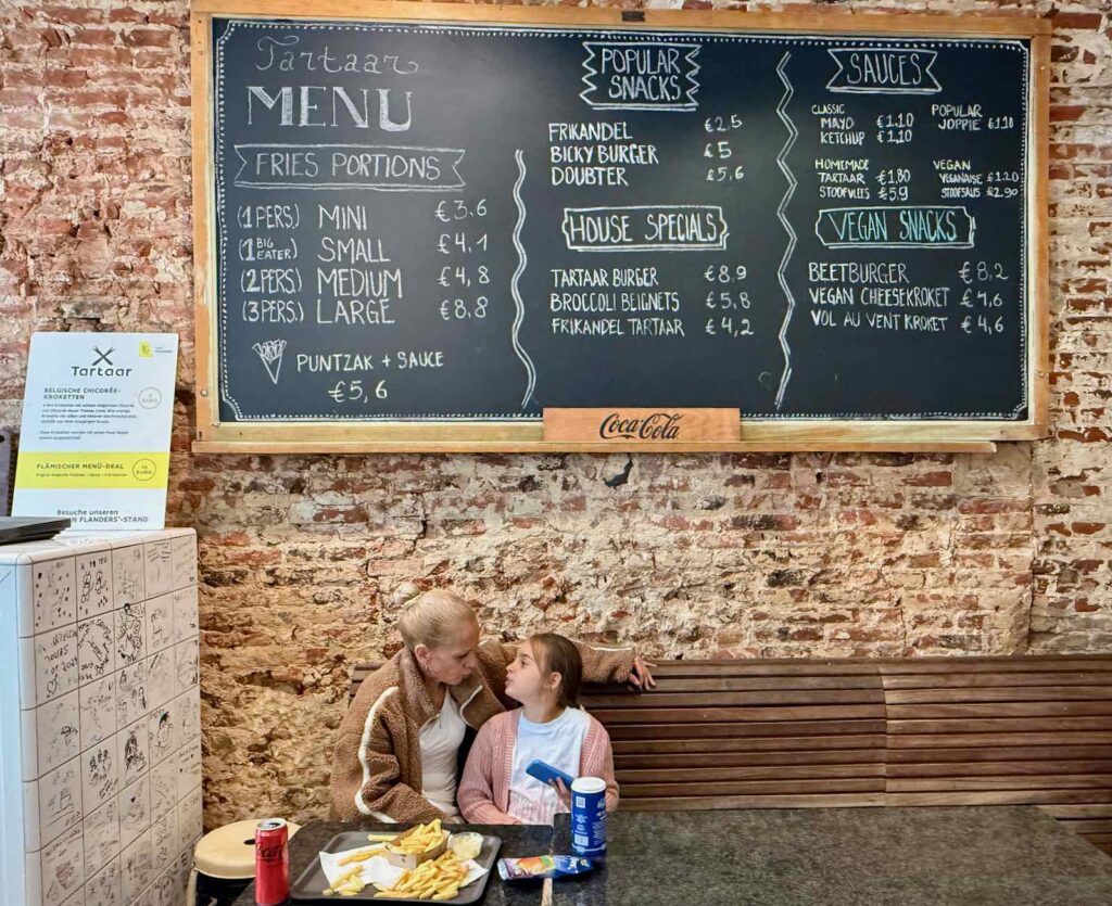 Ici, on mange des burgers, des croquettes au fromage ou au vol au vent 😲, des falafels ou des fricadelles, mais toujours accompagnés d’une montagne de frites. Et toujours à prix très sages.