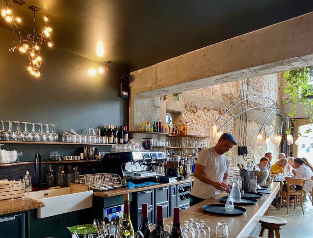 Le même vert ou presque que la façade de PieuX, la maison d’hôtes du même Alexandre Gauthier, à deux pas de là (LIRE ICI). Ici aussi, c’est Lizzie Girard qui s’est chargée de la déco et c’est vraiment réussi. Chaises de jardin jaune soleil et petites tables bistrot, assorties à la façade du resto, donnent le ton.