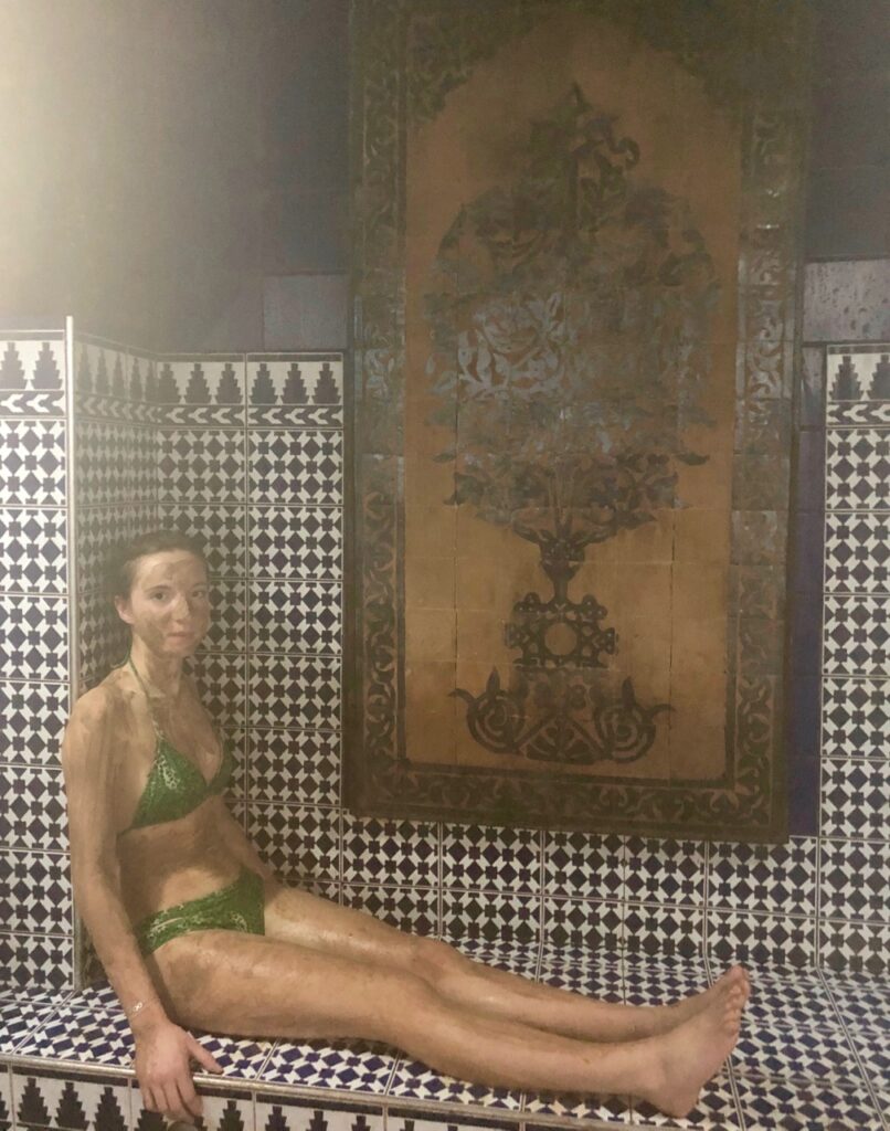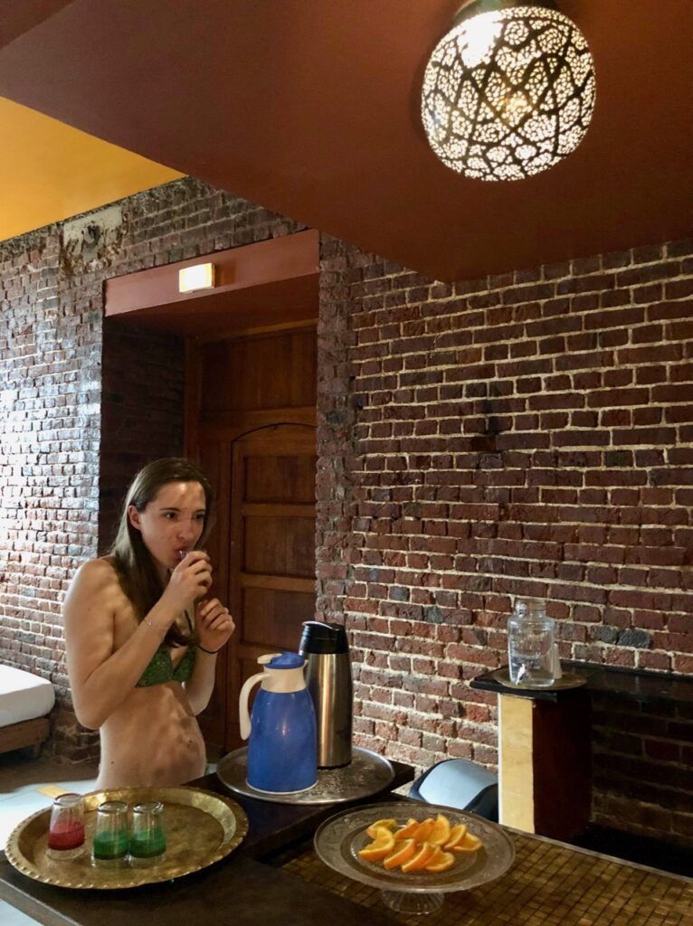 Puis Karima et Marie prennent le relais, dans une cabine spéciale, pour un bon gommage au gant de Kessa, qu’on pourra ensuite emporter chez soi (le mien n’a jamais resservi mais il trône sur le bord de la baignoire). Il doit débarrasser notre petit corps de toutes ses cellules mortes, avant le soin au rassoul. Cet argile naturel de l’Atlas marocain doit nous permettre de retrouver une peau de rêve, en l’hydratant, la purifiant et la reminéralisant.
