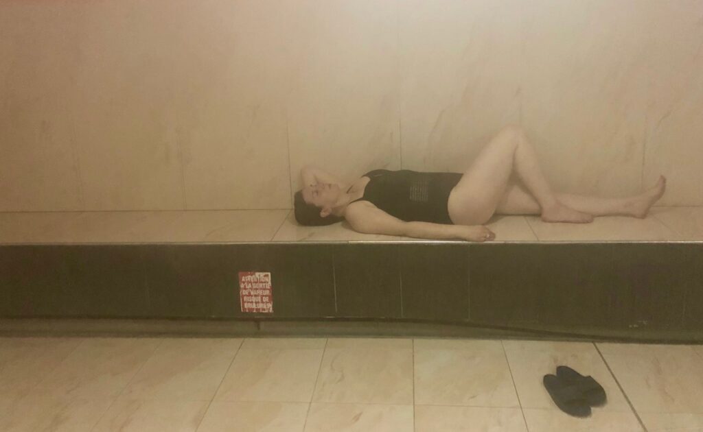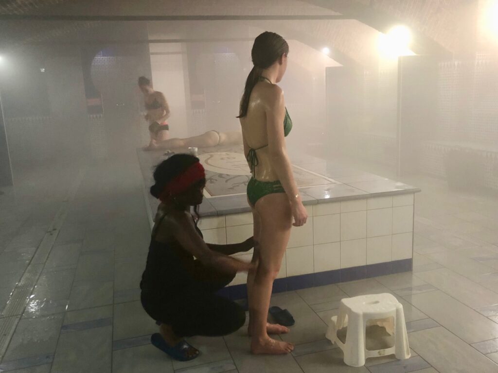 On entre alors dans le vif du sujet, autrement dit dans la grande salle tiède. On y restera une quarantaine de minutes, le temps que la vapeur dénoue les muscles, libère les toxines, commence à délasser le corps et l’esprit. Autour de nous, c’est très multiethnique… Pas mal de nanas qui sont ici un peu comme chez elles…