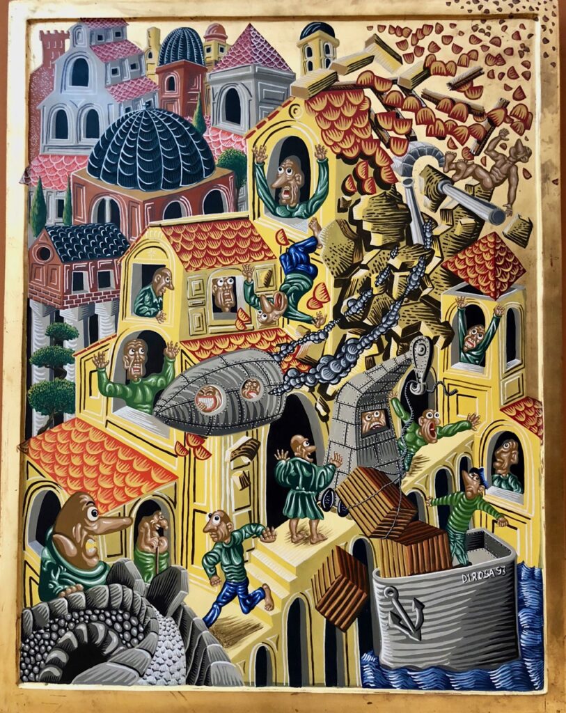 Il découvre des techniques anciennes, qui ont parfois tendance à disparaître. Il s’efforce de les maîtriser et de les intégrer dans son propre travail. Comme cette peinture à l’œuf et à la feuille d’or sur bois apprise en Bulgarie, ici dans Terreur sur la Ville.