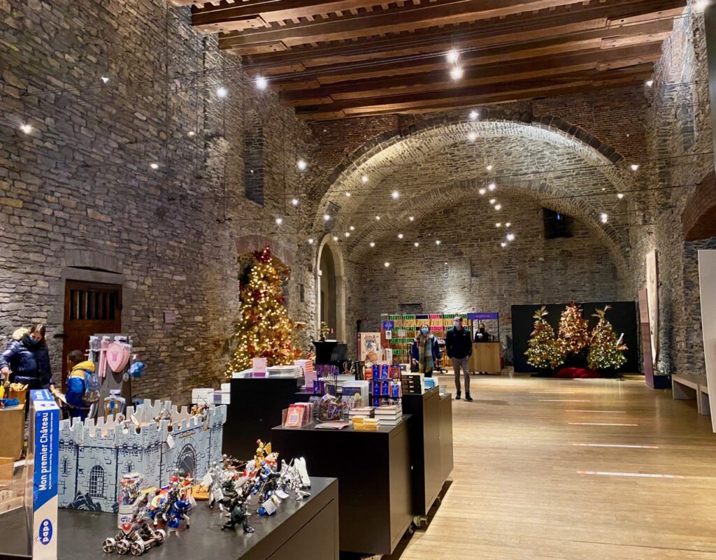 Bon, après cette mise en bouche qui a permis de remonter le temps, nous voici à l’intérieur du château. On traverse la grande salle qui abrite la boutique et on prend les audioguides permettant de faire la visite en compagnie de l’humoriste gantois Wouter Deprez. Et alors là, si j’ai un seul conseil à vous donner, c’est de ne surtout pas vous priver de ce plaisir (compris en plus dans le prix de l’entrée !) Cet homme-là est follement drôle et a le talent rare de transformer une simple visite en moment jubilatoire !