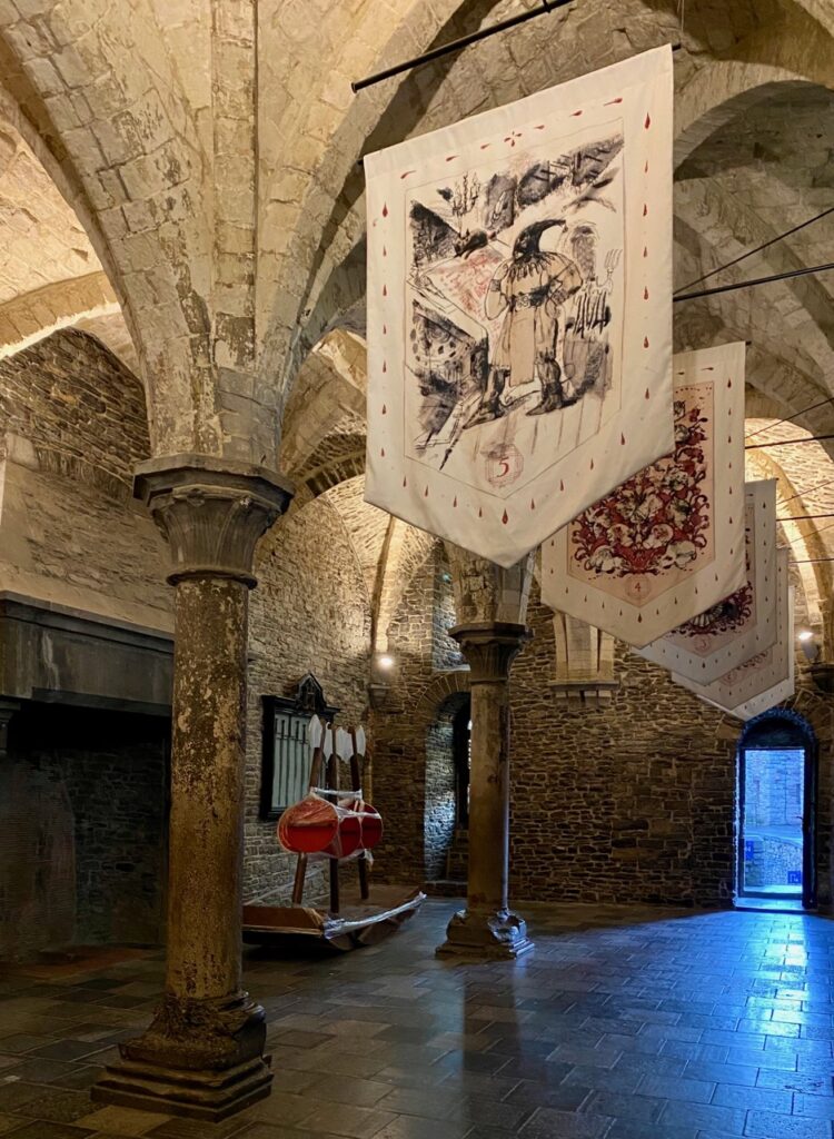 Chaque acte de rébellion, chaque acte répréhensible avait son châtiment dédié, décrit sur cette série de fanions. Fortes têtes peut-être ces Gantois mais aussi soumis à une oppression féodale, des abus de pouvoir et des méthodes de torture que personne ne doit regretter ici…