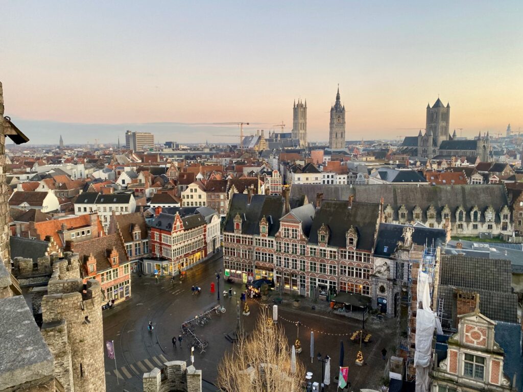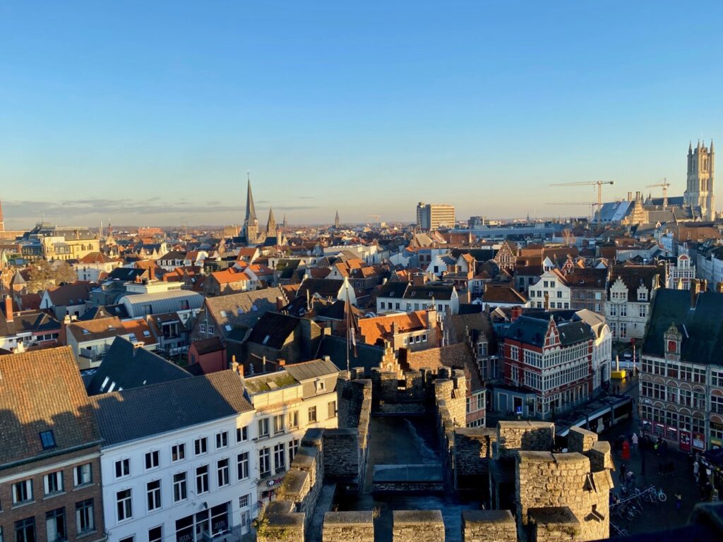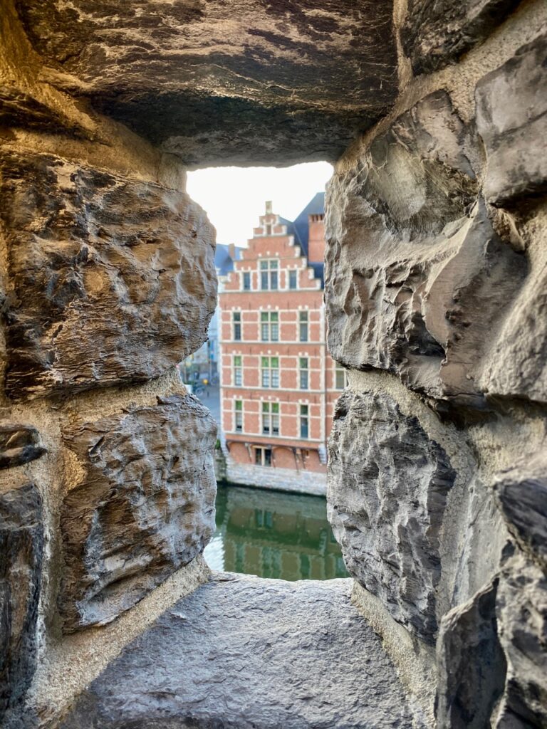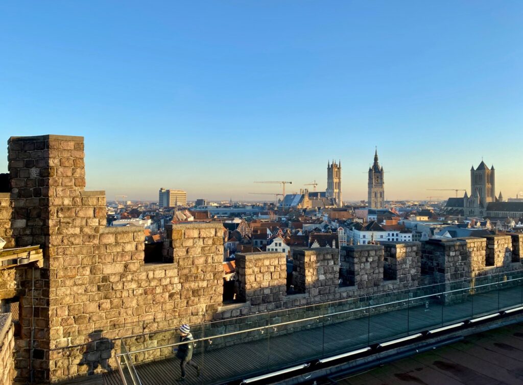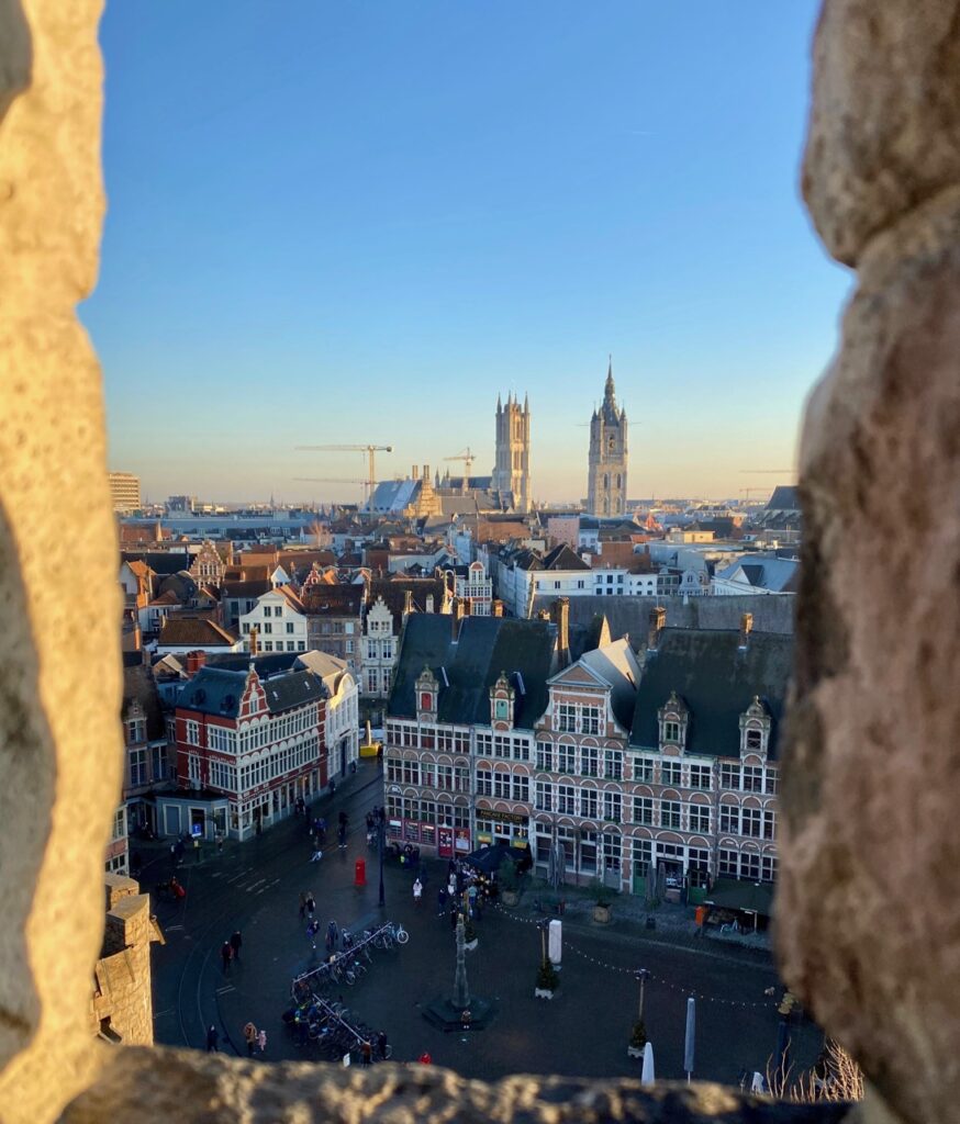 Car oui, monter au donjon est l’un des plaisirs de cette visite. De là-haut, on domine la ville, bien plus encore que depuis le rempart. Ce jour-là, la lumière était superbe, illuminant l’ancien marché aux poissons, les différents clochers et les jolies maisons gantoises…