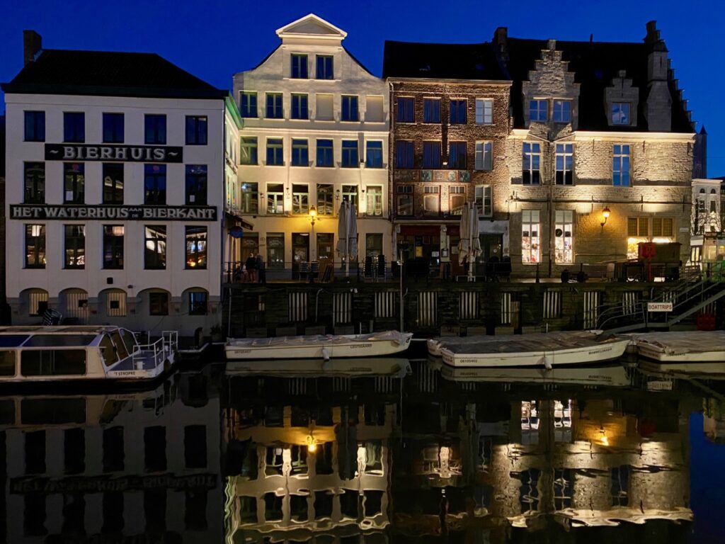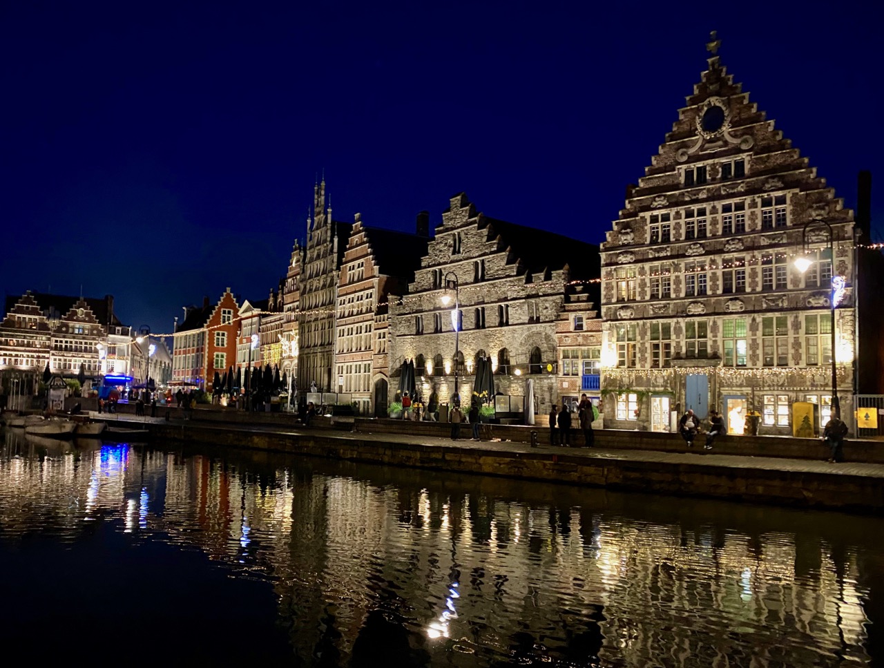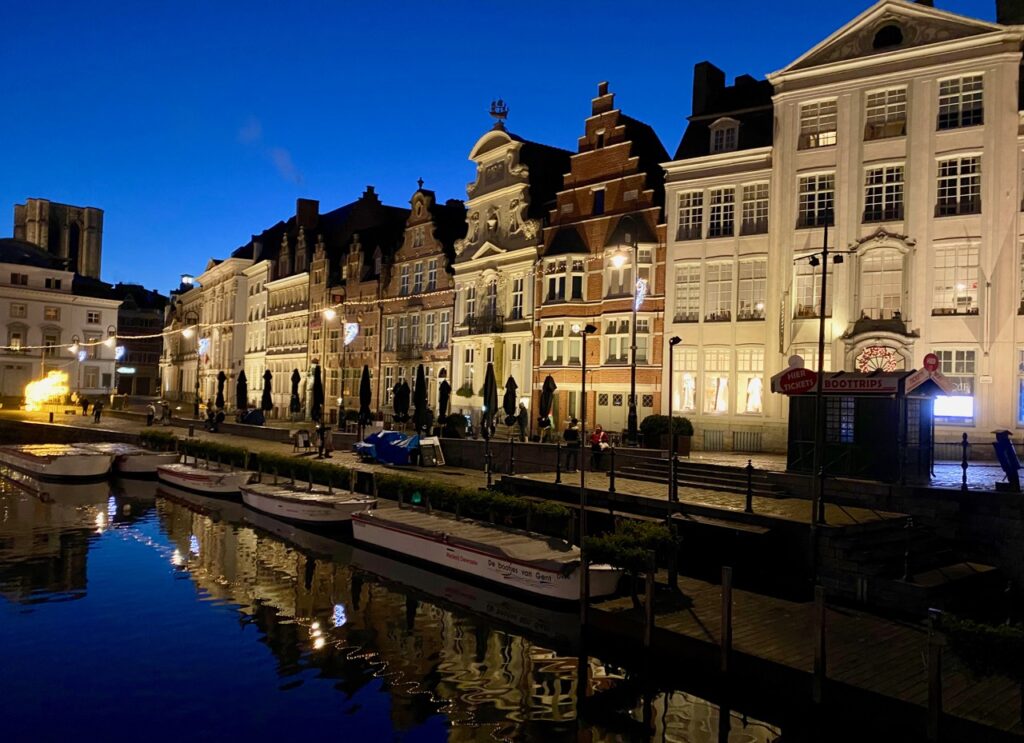 Quelques pas de plus et voici le cœur du Gand illuminé. Le Korenlei (ou quai au Blé) déroule ses élégantes constructions baroques et classiques, en pleine féérie nocturne.