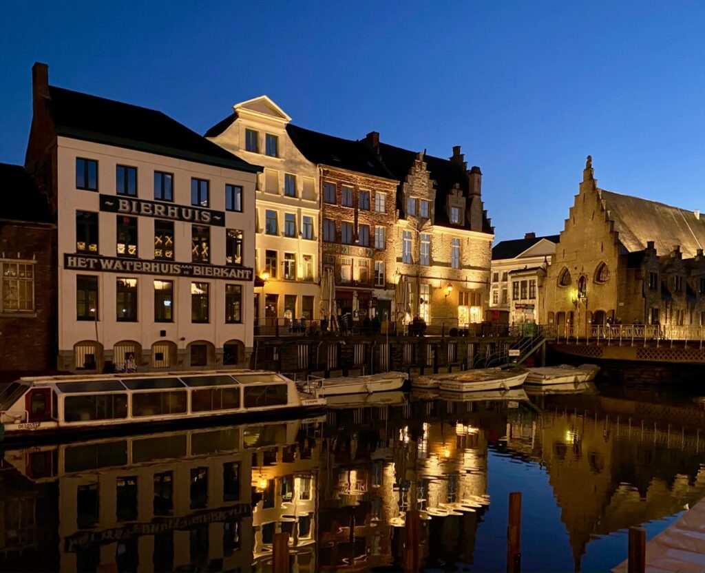 Juste en face, c’est le clou du Gand illuminé, l’apogée du spectacle ! Au Graslei (ou quai aux Herbes), l’ancien port de la cité, les maison des Bateliers, des Mesureurs de grains ou des Maçons s’étourdissent de leur propre beauté, en se mirant dans la rivière.