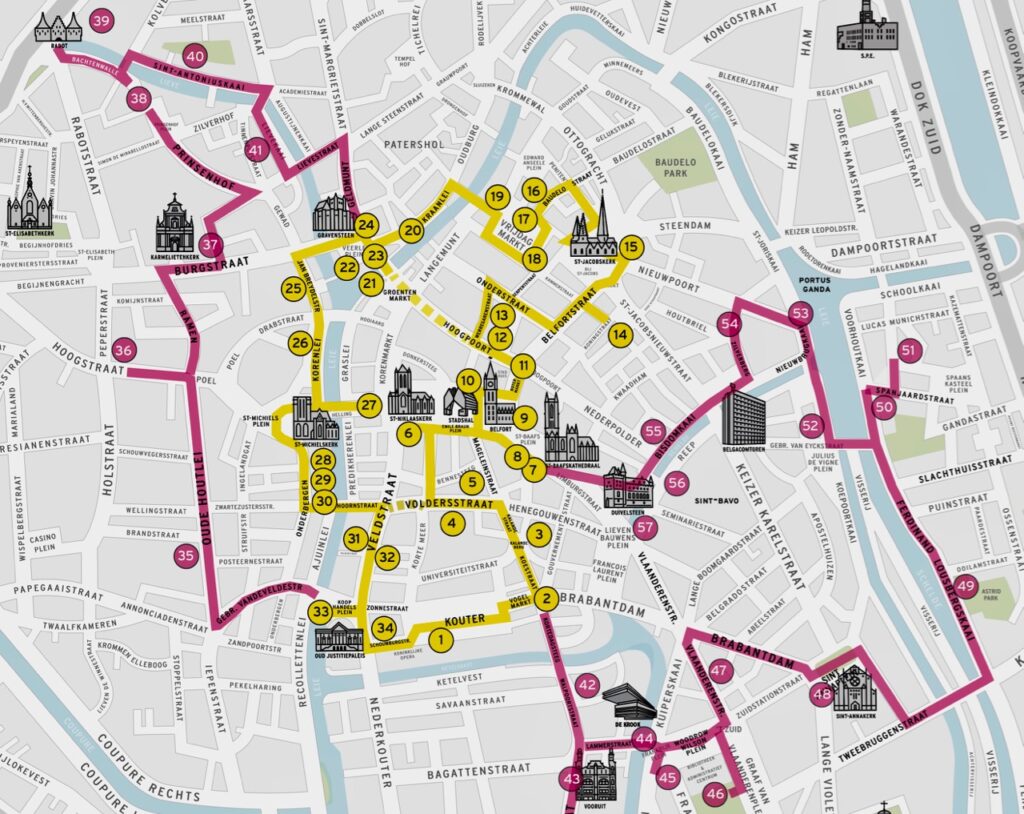 Visit Gent, l’office de tourisme local, a imaginé une promenade balisée pour profiter au mieux de la cité illuminée. La voici ci-dessus, même si le mieux est de la télécharger par ici