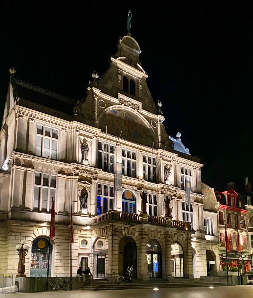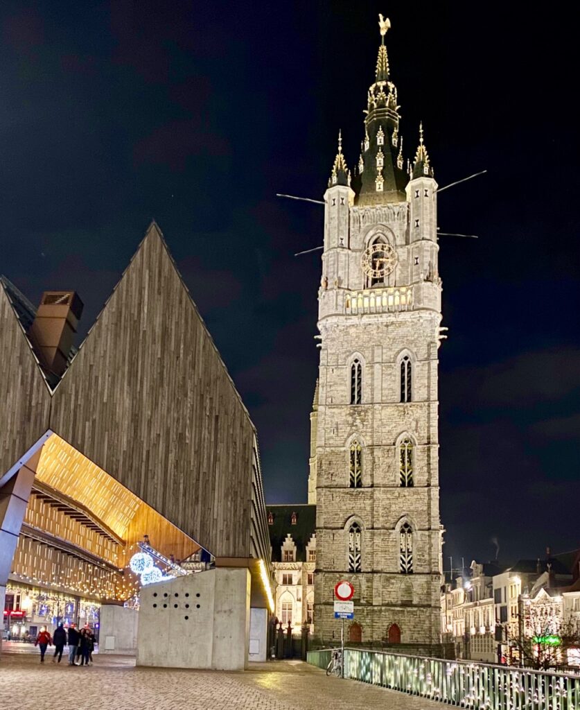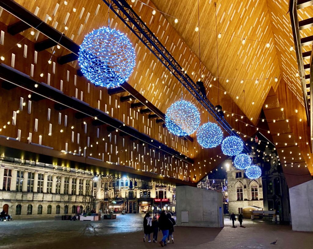 Arrivés au Kouter, on prend enfin la balade dans le bon sens… Jolies rues, ambiances mystérieuses et poétiques, voici la cathédrale Saint-Bavon, le théâtre royal néerlandais aussi connu sous le nom de NTGent, le beffroi mais aussi l’élégante halle municipale, qui accueille une patinoire au moment du marché de Noël.