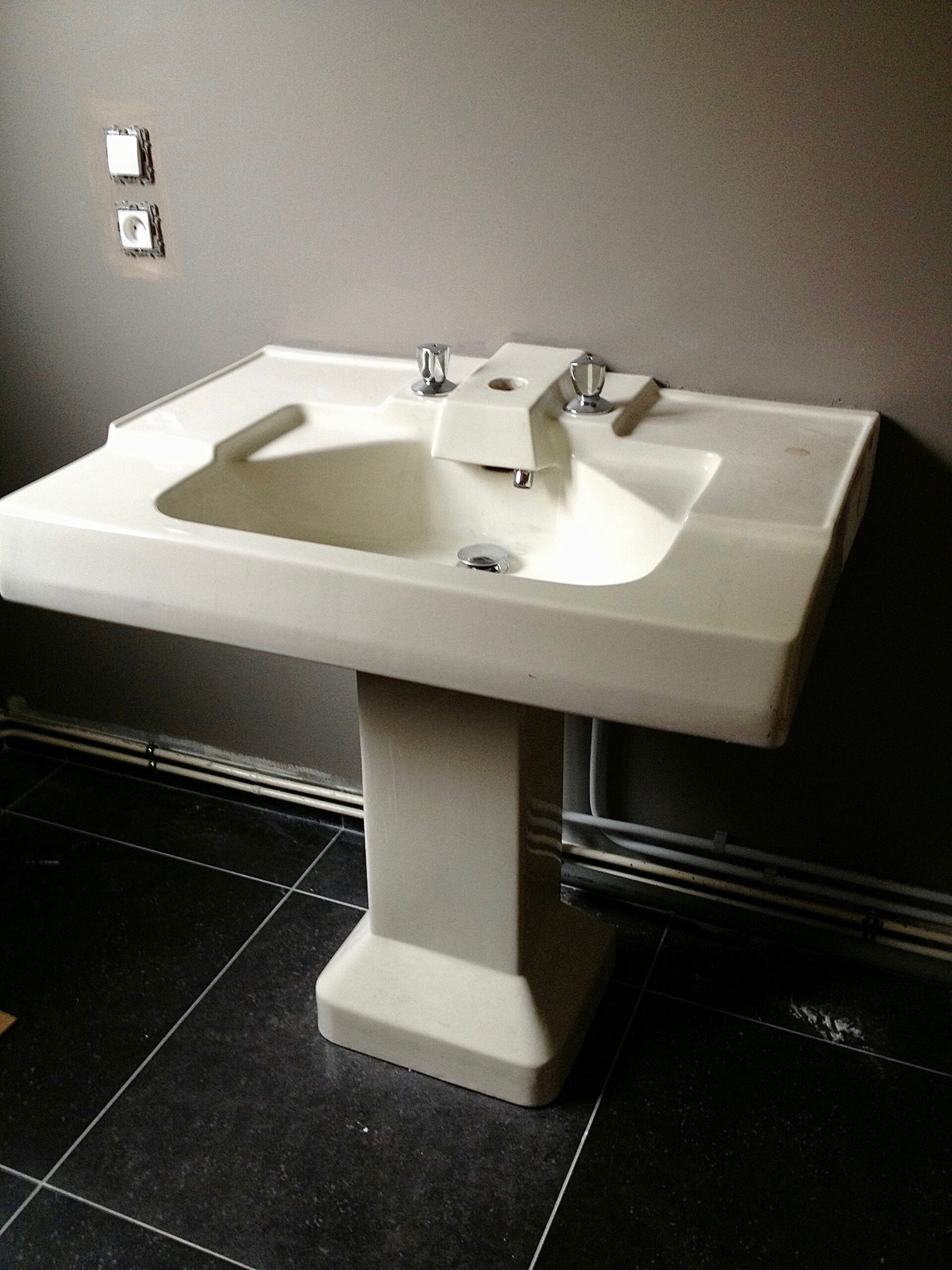 Une des salles de bains de ma maison art déco comporte deux lavabos comme celui-ci, de couleur verte, avec leurs robinetterie d’origine entièrement rénovée. (1938).