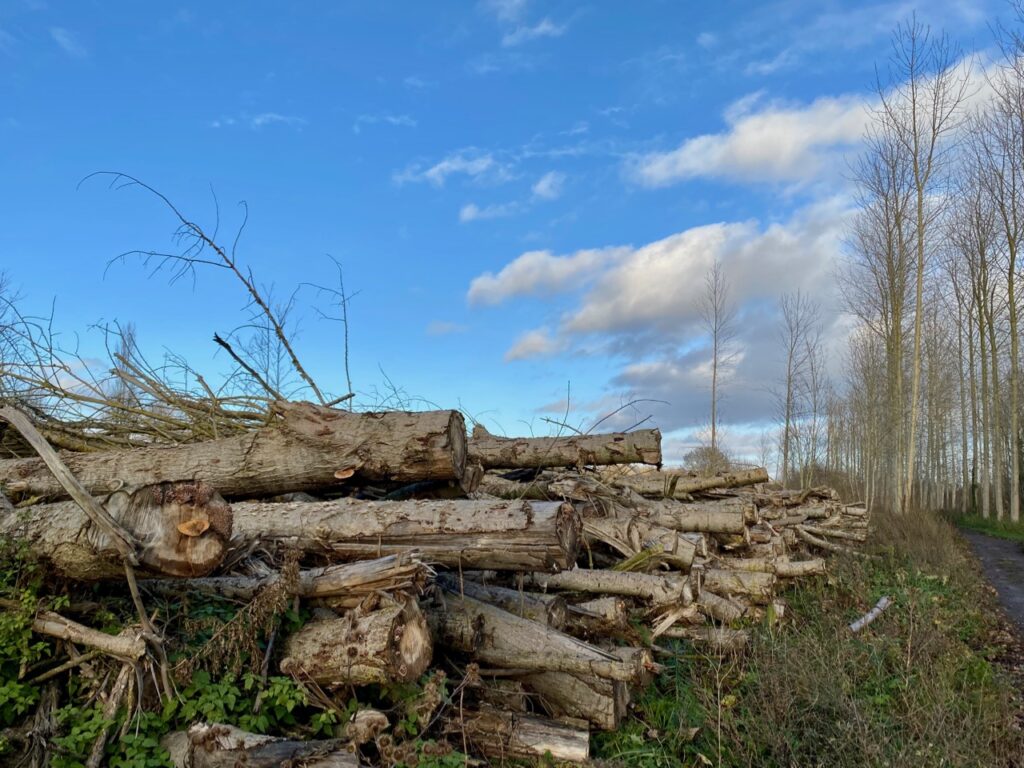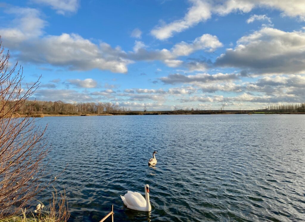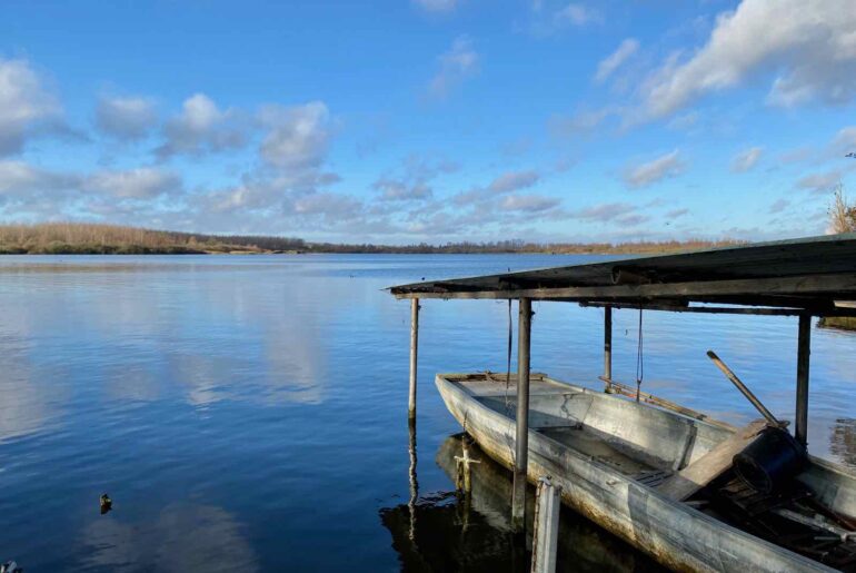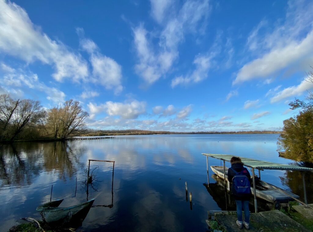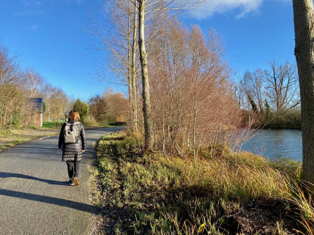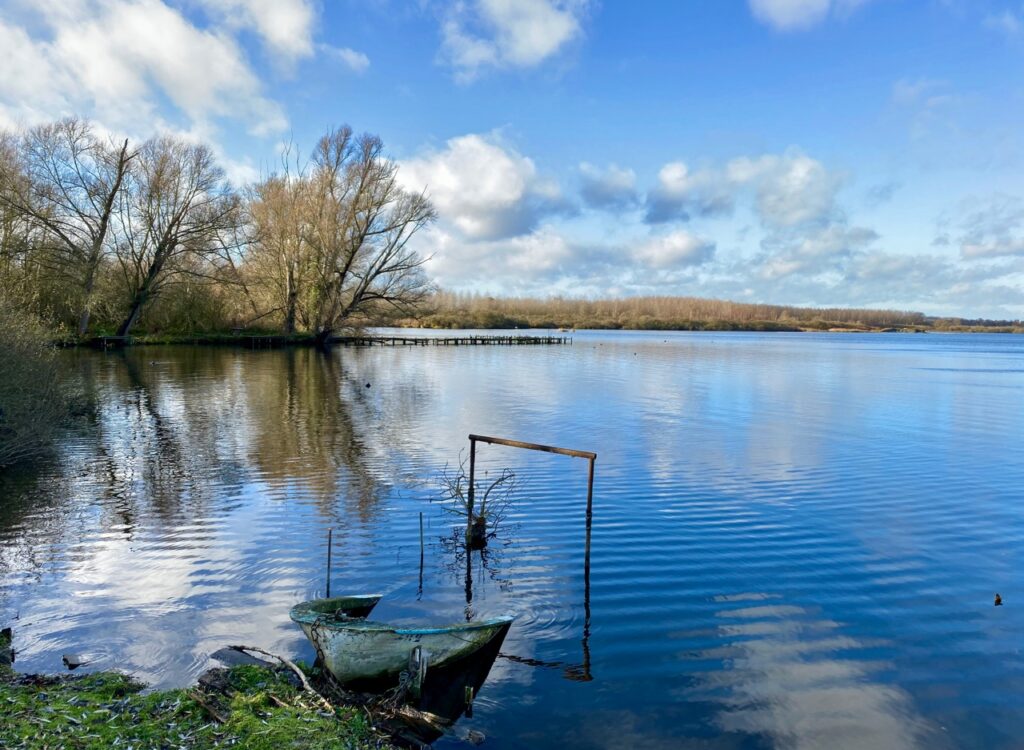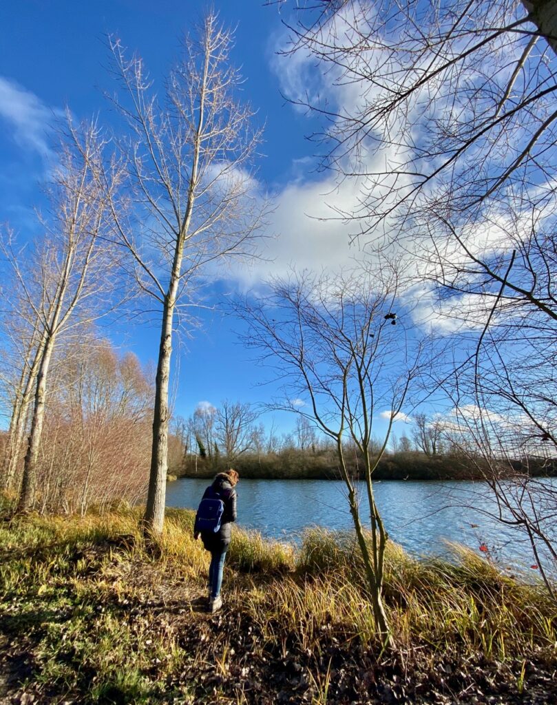 Quelques centaines de mètres seulement et pourtant quel changement d’ambiance ! Une grande étendue d’eau, des nuages qui moutonnent et un beau chemin macadamisé, comme une invitation à avancer entre les arbres déplumés.