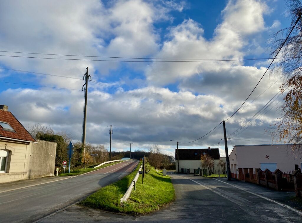 Le temps de traverser une petite passerelle et nous voici sur la D13 qui mène à Palluel. Les champs, la riche terre du Nord et un ciel toujours aussi bleu… Cette journée de décembre est comme un cadeau du ciel, entre jours de pluie et tracasseries covidiennes.