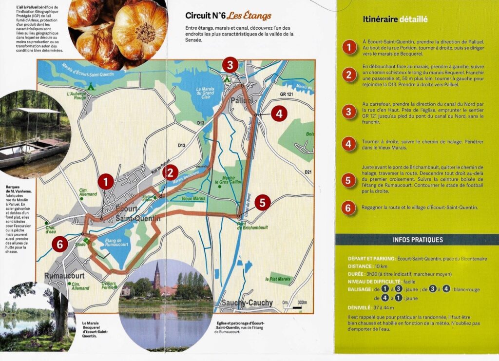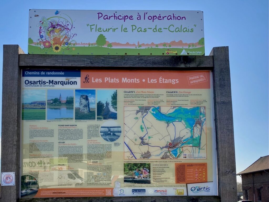Comme indiqué sur le plan, nous sommes parties du village d’Écourt-Saint-Quentin. Là, place du Bicentenaire, il y a tout l’espace voulu pour se garer ainsi qu’un panneau détaillant les circuits de promenade, dont Les Étangs. Et même une baraque à frites juste de l’autre côté de la rue.